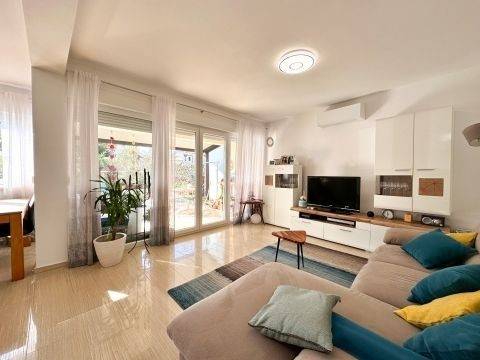 The apartment was modernized and furnished in 2021, with special emphasis on the landscaping of the garden, which is beautifully designed, enclosed by wooden panels and a green fence, and decorated with Mediterranean plants and an impressive bonsai olive tree.