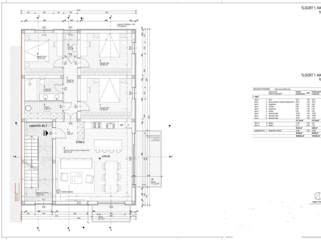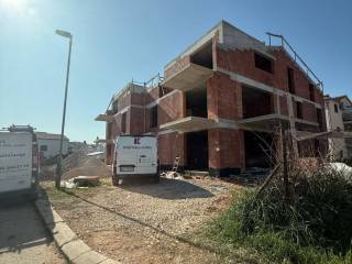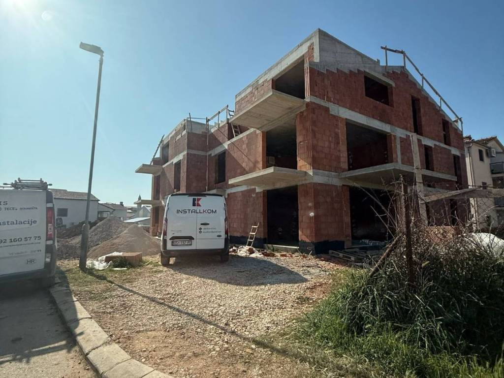 Apartment under construction for sale, Vrsar area, only 700 m from the sea and beach, 111.18 m2 with 4.09 m2 terrace on the 1st floor of a building with 6 apartments.The apartment consists of a hallway, kitchen with dining area and living room, three bedrooms, bathroom, guest toilet, technical room and two terraces.
