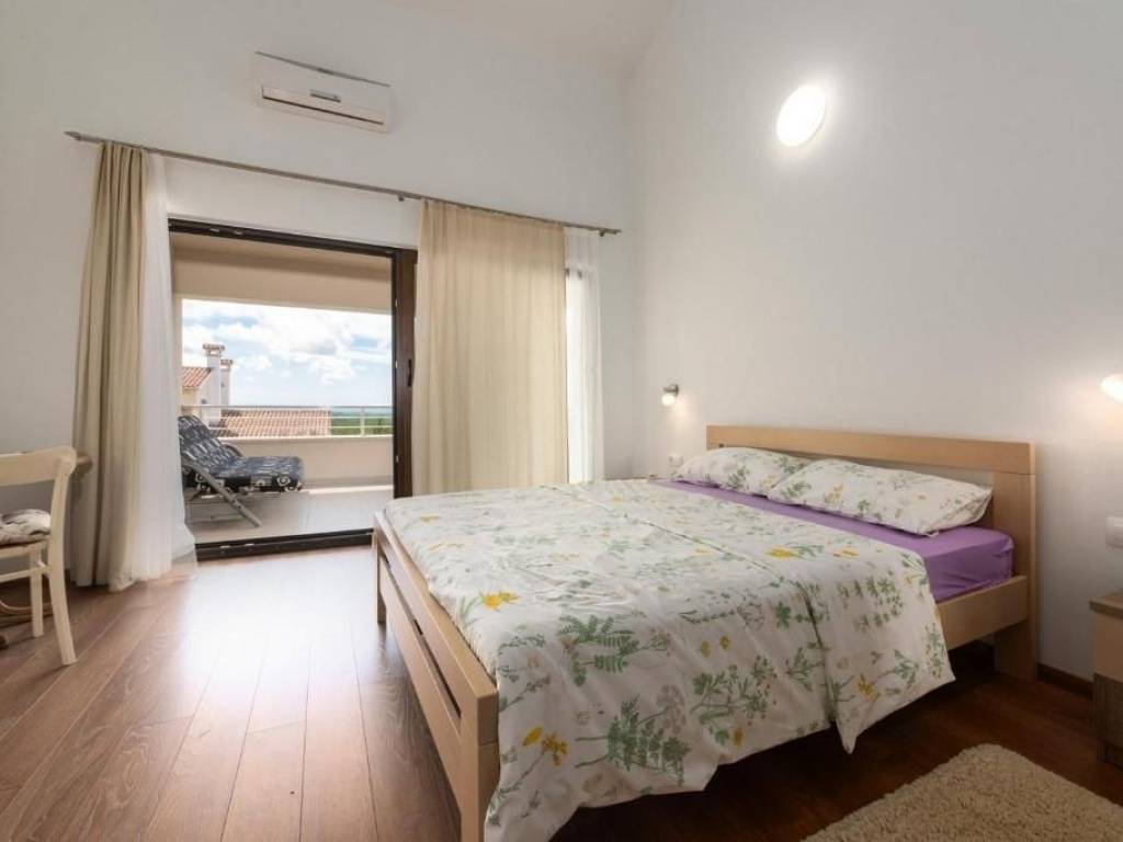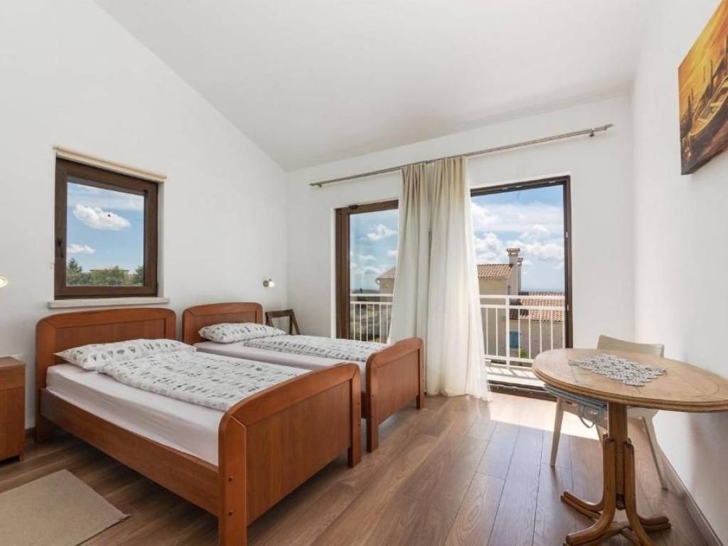 I am selling a villa with a swimming pool located on the edge of the village near Višnjan, 15 kilometers from Poreč and its beaches.The house was built in 2015 and has its own garden with a well-kept lawn and an olive grove of approx. 2,000 m, located in a quiet place with a beautiful panoramic view of the sea, which is emphasized through large glass walls in all rooms of the house.The villa has an area of 160 m on two floors, it consists of a ground floor where there is a kitchen with a dining room and a spacious living room with a fireplace, two exits to a covered terrace, a bedroom with a bathroom and a separate toilet. On the first floor of the house there are two more bedrooms, each with its own bathroom. Both rooms have a beautiful panoramic view of the sea and greenery. The villa offers parking for 3 vehicles, a swimming pool of 36 m and a summer kitchen.The house is heated and cooled by air conditioning, there is also underfloor heating with a heat pump and solar panels on the roof.