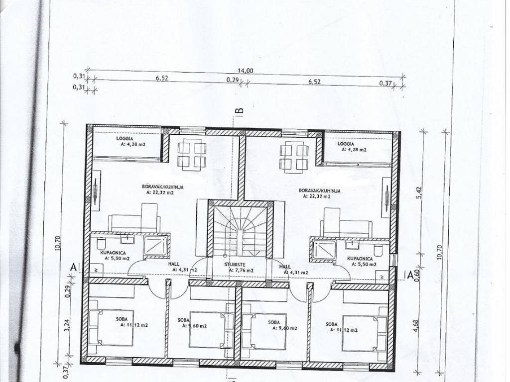 An apartment under construction on the 1st floor of a building with 4 residential units is for sale.The apartment consists of an entrance hall, a kitchen with a dining room and a living room, two bedrooms, a bathroom and a terrace with a partial view of the sea.The apartment is equipped with underfloor heating with a heat pump and air conditioning in all rooms.The apartment has one parking spot.There are two apartments for sale on the first floor, completion of construction 12/24