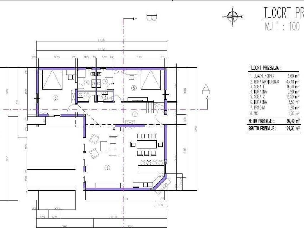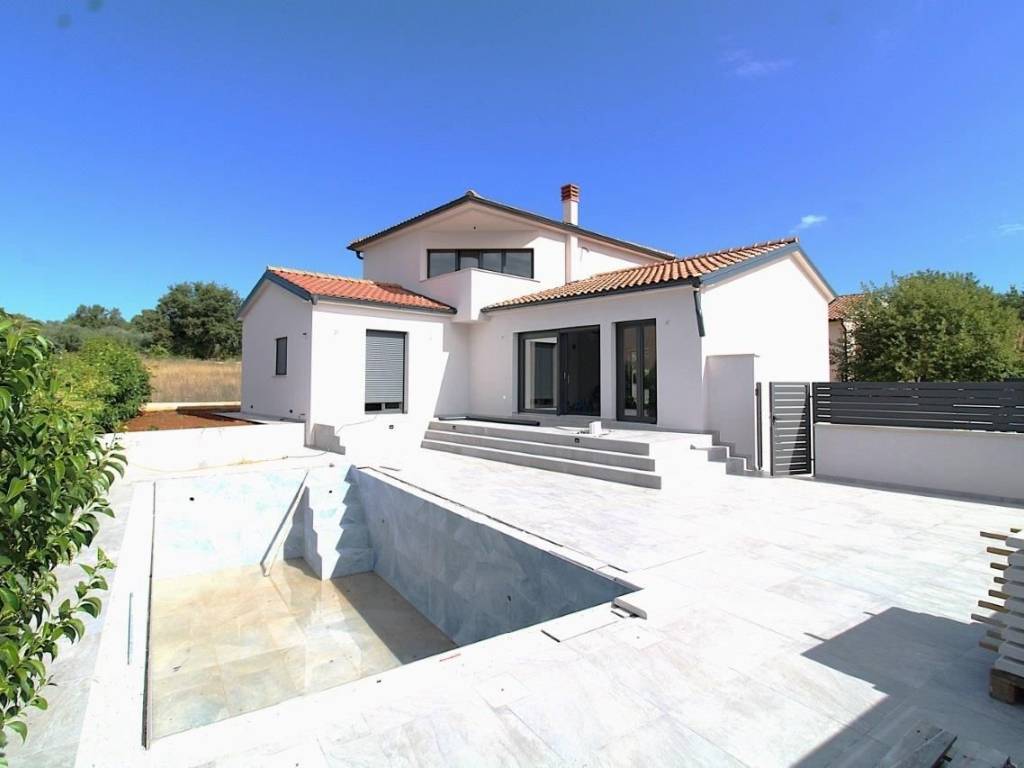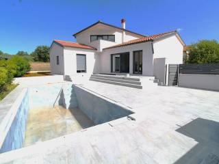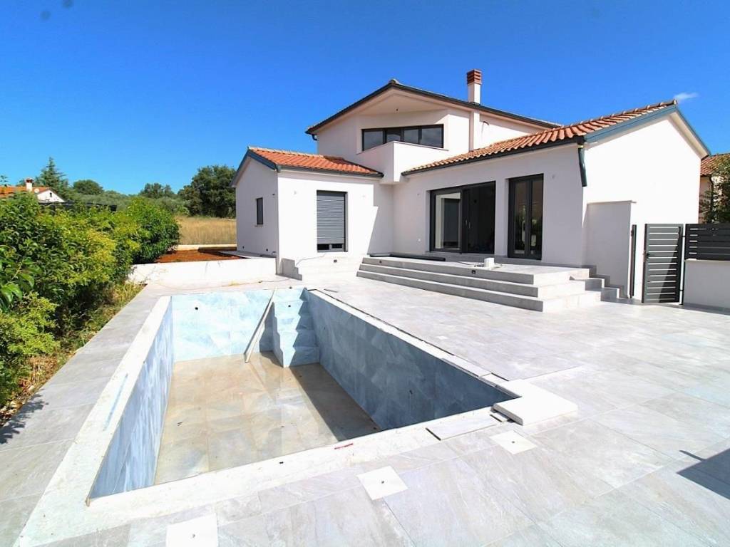Construction of a villa with a swimming pool has begun in a nice small town 10 km from the center of Poreč.The planned completion of construction is in the summer of 2024, and in the current phase some changes are still possible at the request of the future buyer.On the ground floor of the house there is an entrance hall, toilet, kitchen with dining room, followed by a living room with access to the yard/sundeck with a swimming pool. Two bedrooms with their own bathrooms are also planned on the ground floor. On the first floor there is also a master bedroom with a bathroom and exit to the balcony.Two parking spaces in front of the house.The total gross area of the house is 182.50m2, net 141.40m2