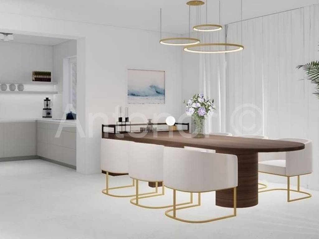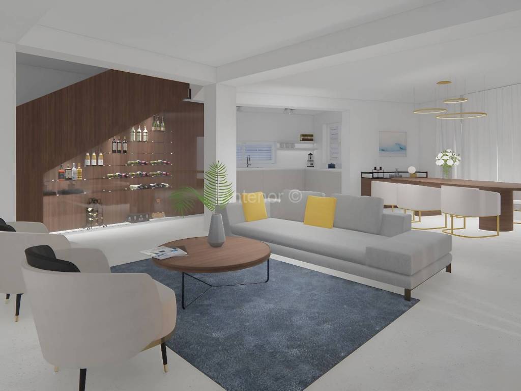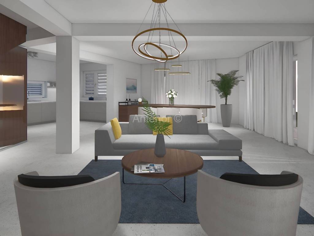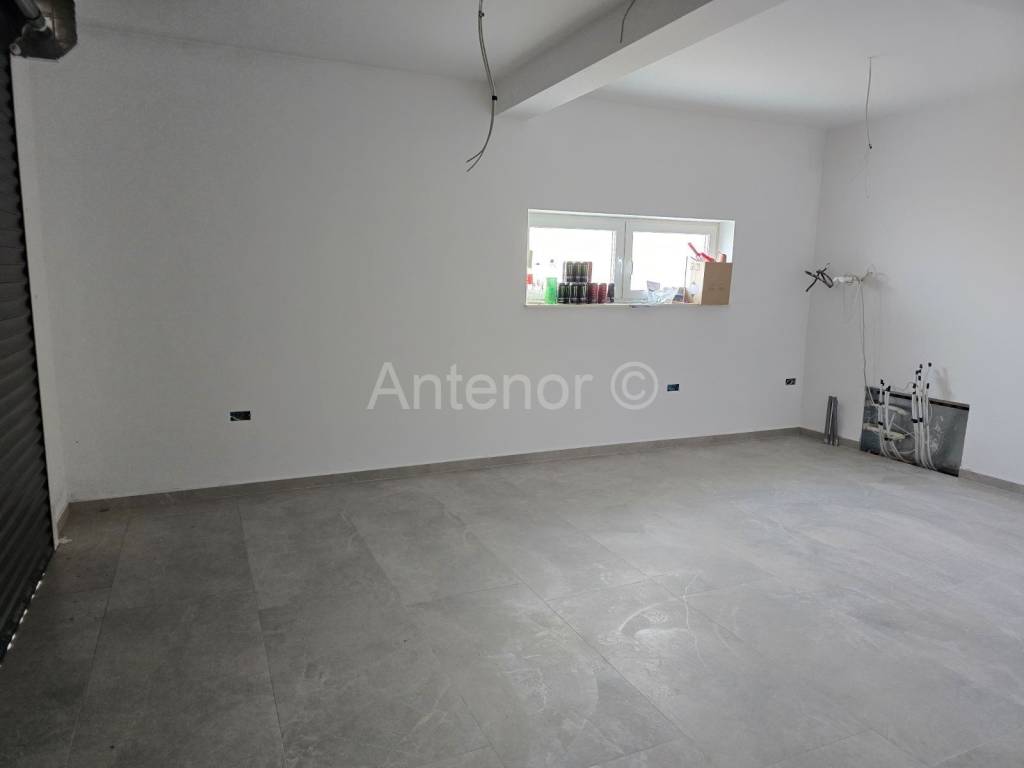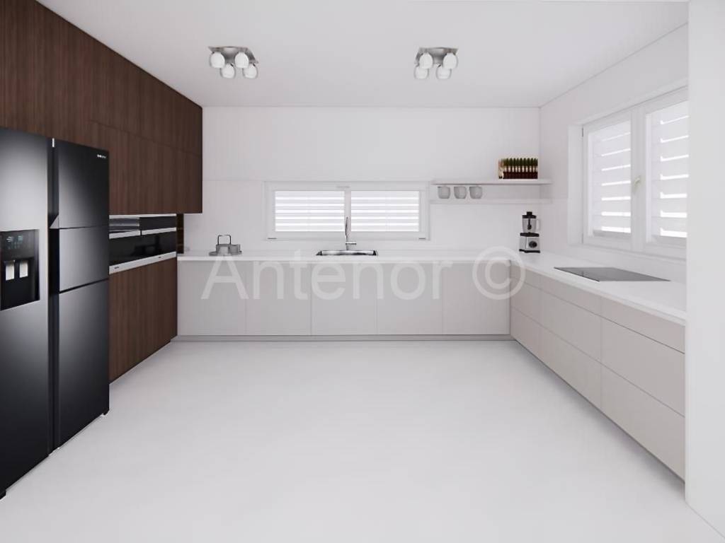 U prizemlju je smješten dnevni boravak s kuhinjom i blagovaonicom otvorenog koncepta iz kojih se direktno izlazi na prostranu natkrivenu terasu površine 24,90 m2 i vanjski bazen (9x3 m).U prizemlju je smještena i garažakoja ima direktan pristup stambenom dijelu kuće.