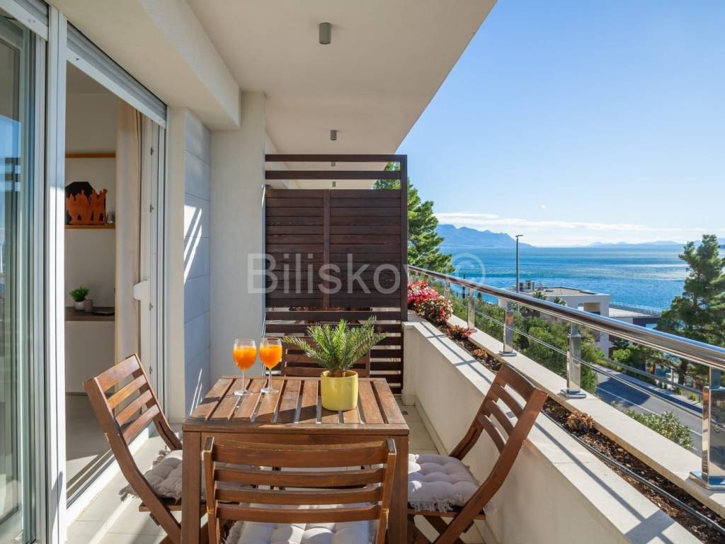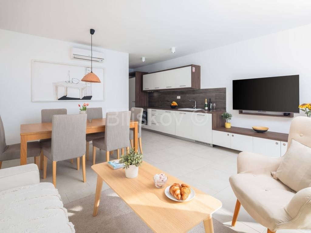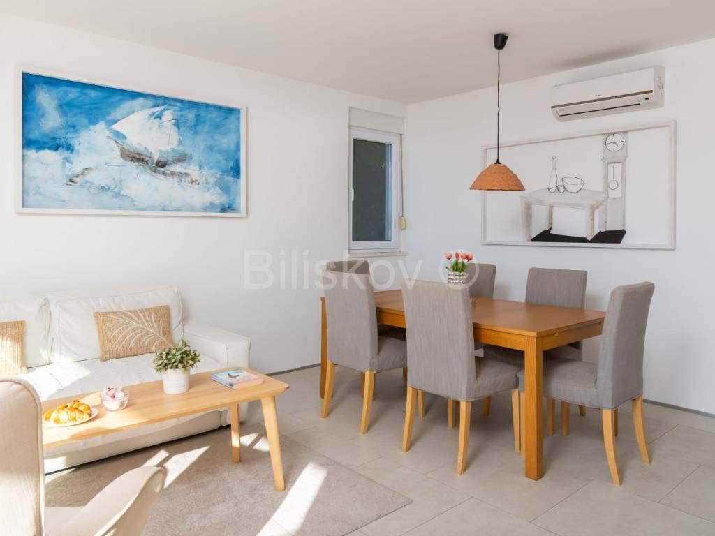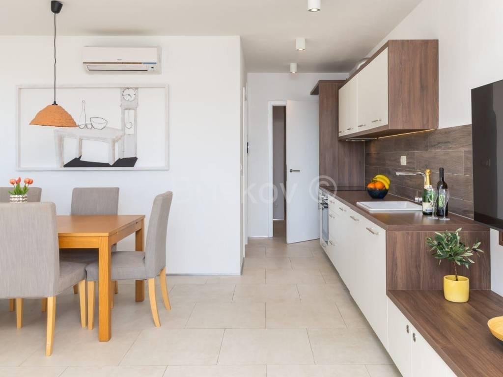 Stan odiše suvremenim dizajnom i udobnošću te je potpuno opremljen i odmah spreman za useljenje. Prostor se sastoji od prostranog dnevnog boravka povezanog s kuhinjom i blagovaonicom iz koje se izlazi na balkon s otvorenim pogledom na more. Dvije spavaće sobe i dvije elegantno uređene kupaonice nude maksimalnu praktičnost i komfor. Glavna spavaća soba ima vlastitu terasu, dok druga soba s dva odvojena kreveta pruža savršeno rješenje za djecu ili goste.