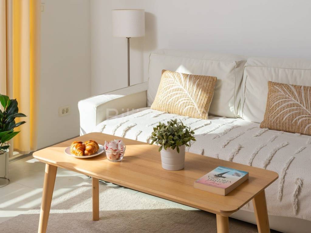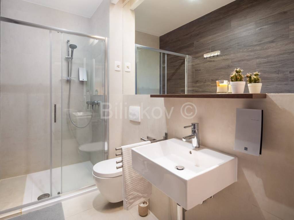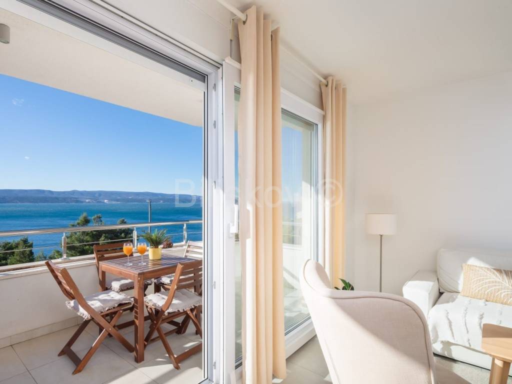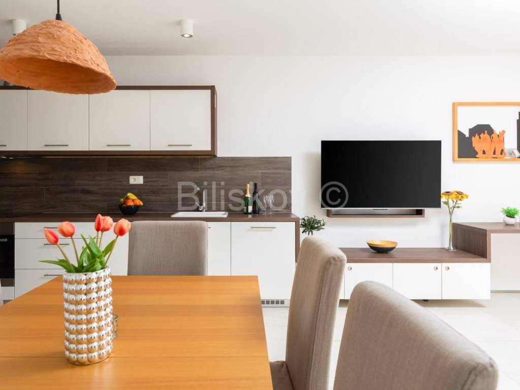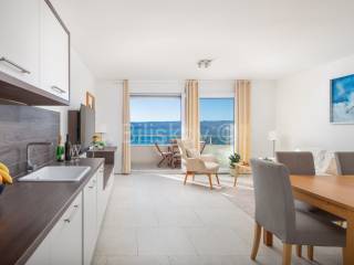 Stan odiše suvremenim dizajnom i udobnošću te je potpuno opremljen i odmah spreman za useljenje. Prostor se sastoji od prostranog dnevnog boravka povezanog s kuhinjom i blagovaonicom iz koje se izlazi na balkon s otvorenim pogledom na more. Dvije spavaće sobe i dvije elegantno uređene kupaonice nude maksimalnu praktičnost i komfor. Glavna spavaća soba ima vlastitu terasu, dok druga soba s dva odvojena kreveta pruža savršeno rješenje za djecu ili goste.