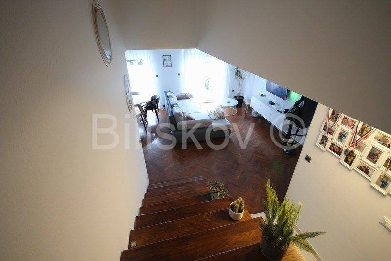 It consists of a hallway with a staircase, bathroom, kitchen, dining room and living room and anteroom on the lower floor, and four bedrooms (one has been converted into a wardrobe) and a bathroom on the upper floor. The total net usable area of the apartment is 95.79 m2, and the accompanying terrace of 12.20 m2 which is connected to the living room - 108 m2.