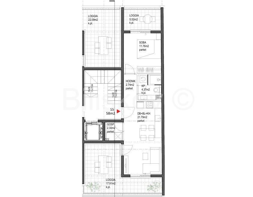 www.biliskov.com ID: 14808TrešnjevkaA two-bedroom apartment of 58 m located on the 2st floor of a modern new building with an elevator, scheduled for completion in early 2026.The apartment consists of an entrance hallway, an open-plan living room with a kitchen and dining area that opens onto a loggia, a bedroom also with access to the loggia, and a bathroom with a toilet.
