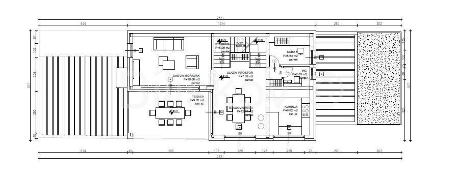 On the second floor there is an entrance area, a living room with an exit to the terrace with a beautiful view of the greenery and the city, a kitchen, a dining room, a bedroom and a guest toilet.