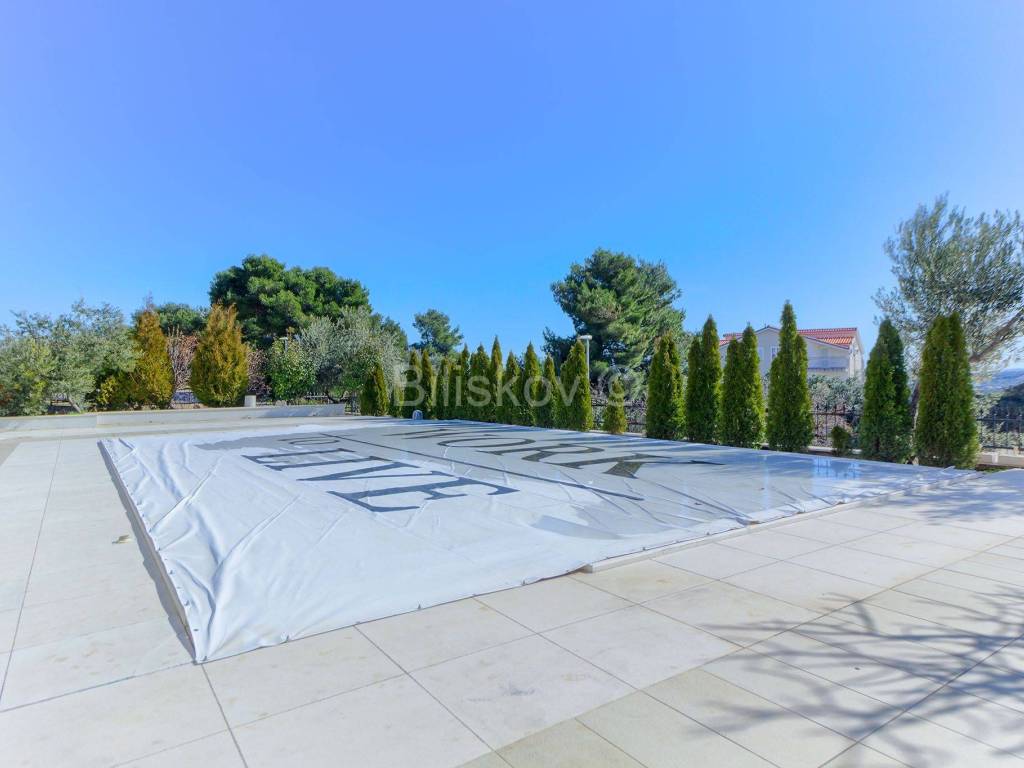 Ispred kuće se nalazi bazen sa uređenom terasom i okućnicom. Iza kuće se nalaze parkirna mjesta.