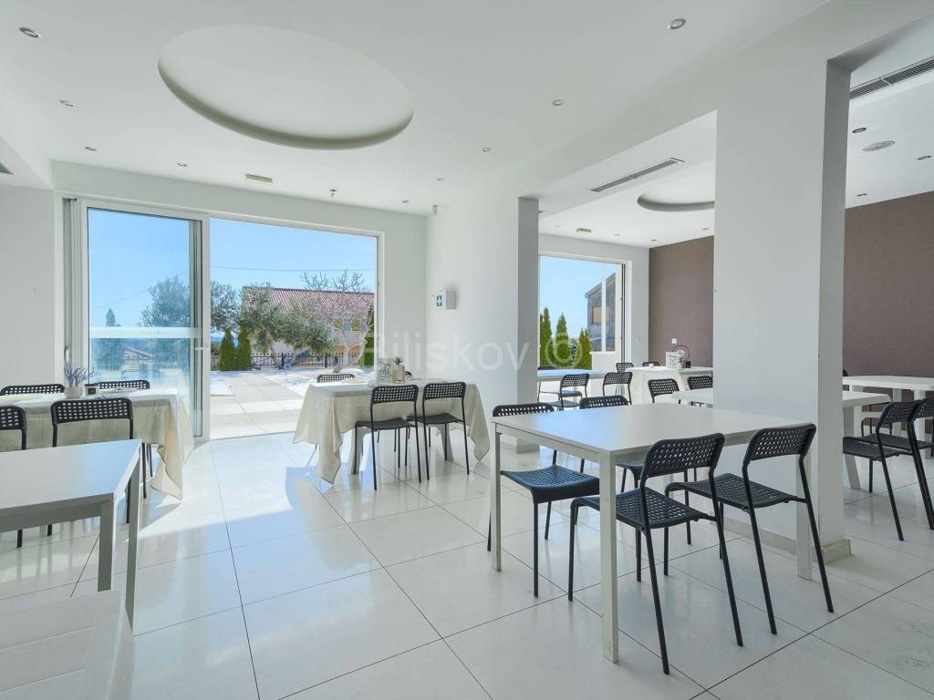 Prvi kat površine 253,79m2 sastoji se od dnevnog boravka, kuhinje, četiri spavaće sobe, dvije kupaonice, recepcija, caffe bar, natkrivena terasa.