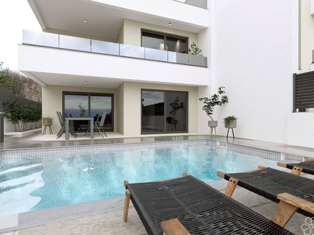 Apartment AS-1 Ground floor Living area: 92.67 m (3 bedrooms + 2 bathrooms + WC) + Covered terrace (17 m SE) + Yard with pool (24 m) + Two outdoor parking spaces, total net area 112.40 m = EUR 430,000