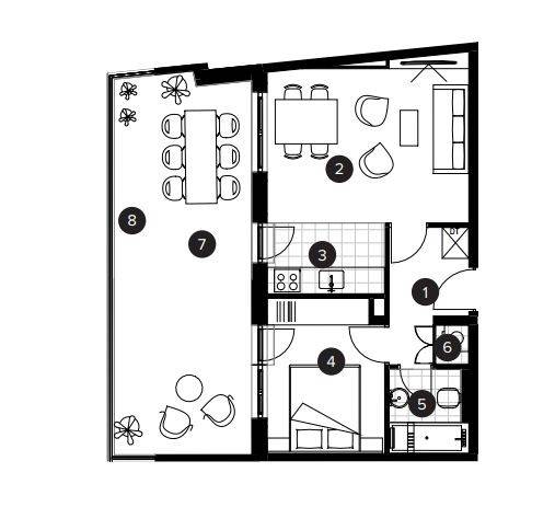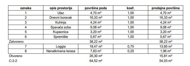 Stan će se nalaziti na drugom katu zgrade, ukupne prodajne površine 54,03 m (ukupna neto površina poda iznosi 64,52 m), a sastoji se od ulaznog prostora, open-space dnevnog boravka s blagovaonicom, kuhinje, spavaće sobe, kupaonice, nenatkrivene terase, loggie i spremišta.