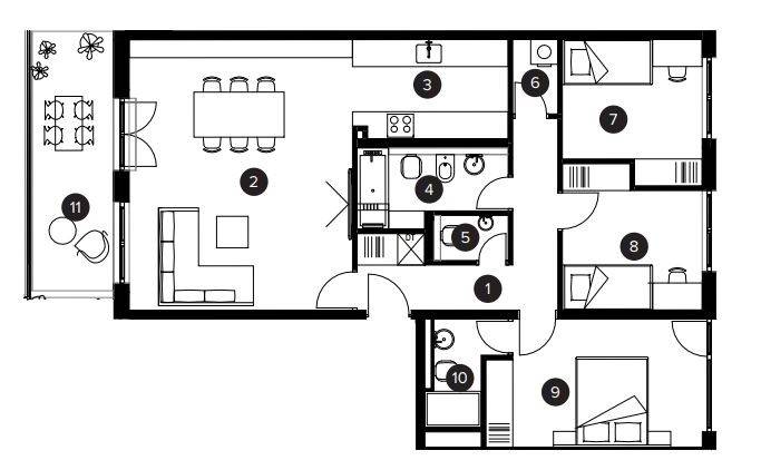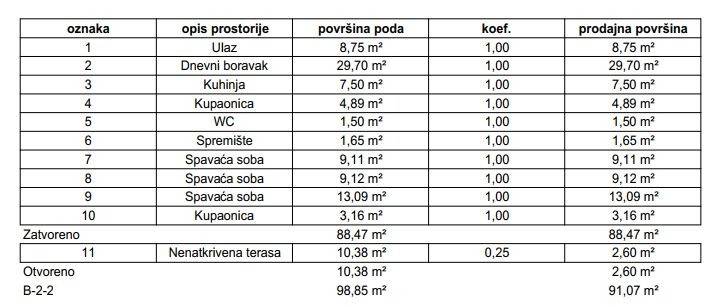 Stan će se nalaziti na drugom katu zgrade, ukupne prodajne površine 91,07 m (ukupna neto površina poda iznosi 98,85 m), a sastoji se od ulaznog prostora, open-space dnevnog boravka s blagovaonicom, kuhinje, tri spavaće sobe, dvije kupaonice, zasebnog WC-a, nenatkrivene terase i spremišta.