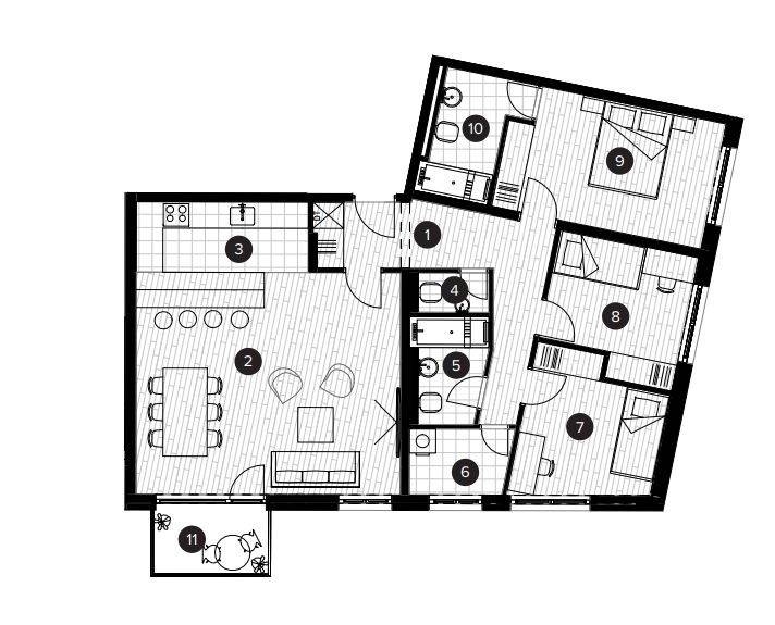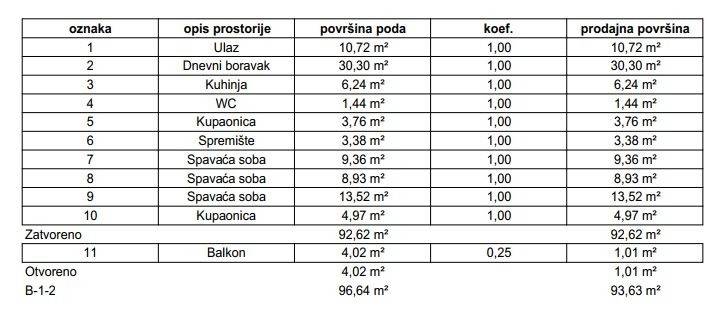 Stan će se nalaziti na prvom katu zgrade, ukupne prodajne površine 93,63 m (ukupna neto površina poda iznosi 96,64 m), a sastoji se od ulaznog prostora, open space dnevnog boravka s blagovaonicom, kuhinje, tri spavaće sobe, kupaonice, zasebnog WC-a, balkona i spremišta.