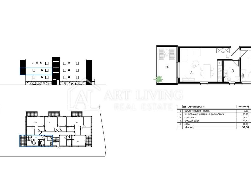 Apartment SJ6, with a total net living area of 50.15 m², is located on the first floor of the residential and commercial building. It consists of an entrance area, a living room with kitchen and dining area, a bedroom, a bathroom, and a loggia of 11 m².