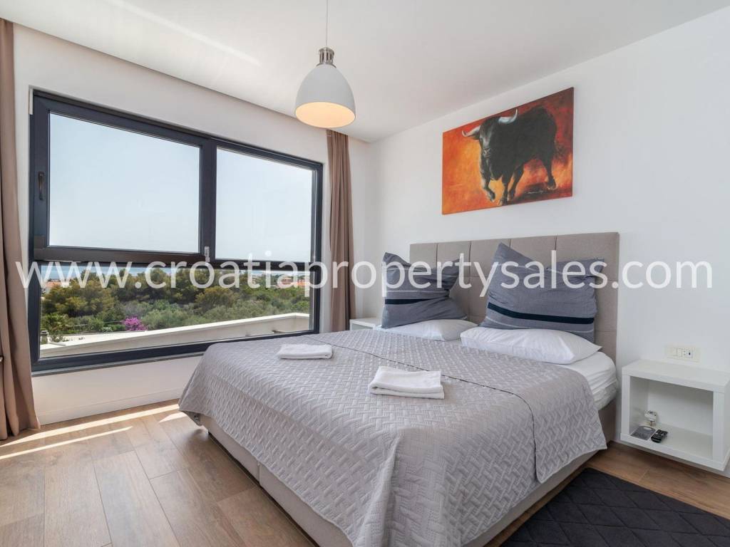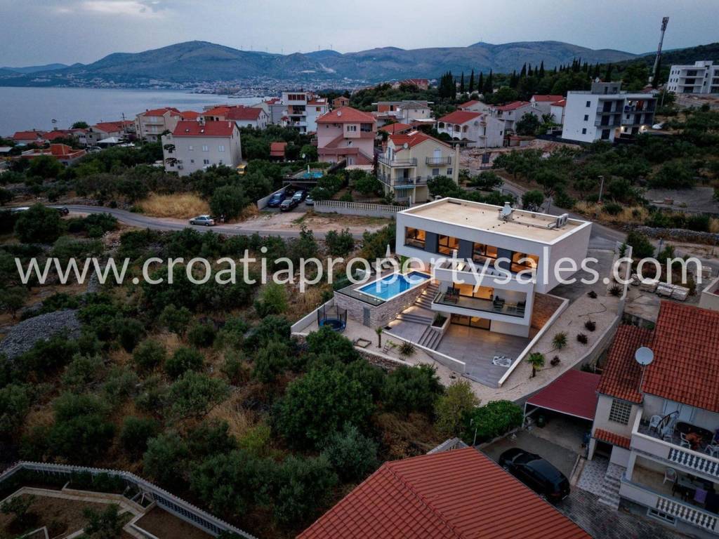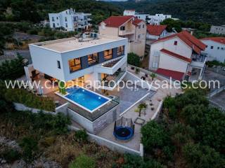 A spectacular villa in our portfolio. This villa is located on the south side of Čiovo island, not far from the sea and the center of Okrug with all amenities. It’s positioned in an area where road access is quick and easy. The villa itself consists of 3 floors, with a large outdoor area, and a heated pool. Total size of the plot is 732 m2, while the living area is 300 m2, including the balconies. The ground floor consists of a spacious living room with a wooden fireplace, a nice, fully equipped kitchen and one bedroom and a bathroom.From there, we can enter the outdoor area, with a covered terrace that has a nice sitting area, overlooking the sea. Additionally, there is a heated swimming pool, also with a nice sea view. In the basement area, there is a large space, used for a small gym and a sauna. It also has direct access to the outdoor area. On the top floor, we have 4 en-suite bedrooms, similar size and layout. On the opposite side of the rooms, there is one more spacious balcony that can be used for various things. This villa is fully furnished and with excellent taste. It can be used right away, without any additional investment. The advantage of this property is a high rental income, and it does not have to be a seasonal rental property, but a full year around. There is parking for at least 3 vehicles, and it has easy access on and off the island.