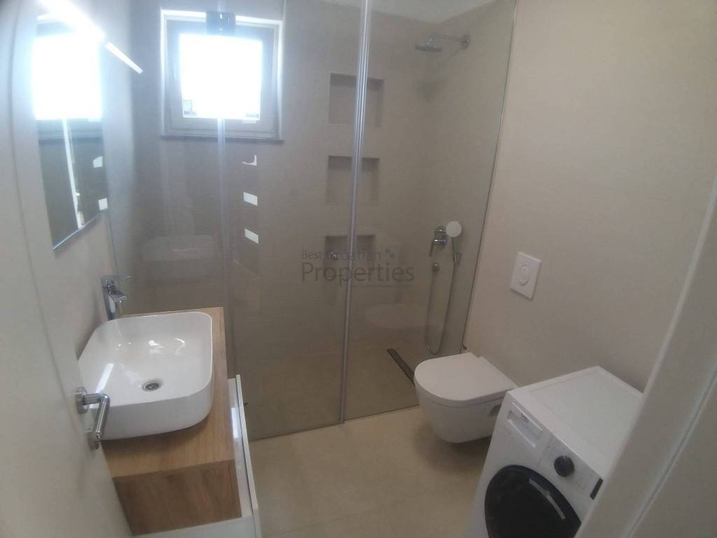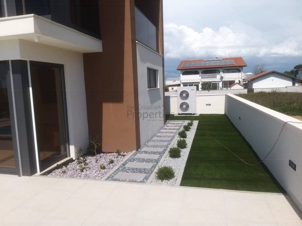 Opremljena je i uređena s visokokvalitetnim materijalima i opremom: podovi su obloženi visokokvalitetnom keramikom, opremljena je PVC stolarijom s električnim roletama, termofasadom debljine 10cm, podno grijanje preko dizalice topline i klima uređaji te je napravljena priprema za grijanje bazena.Ova nekretnina predstavlja odličnupriliku za drugi dom u Hrvatskoj, a kako za stanovanje tako iu svrhe iznajmljivanja.