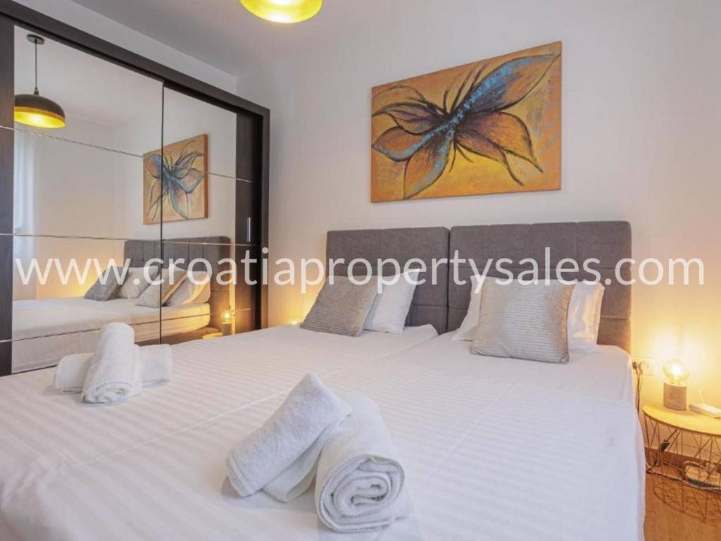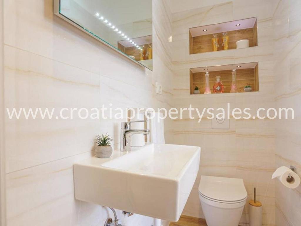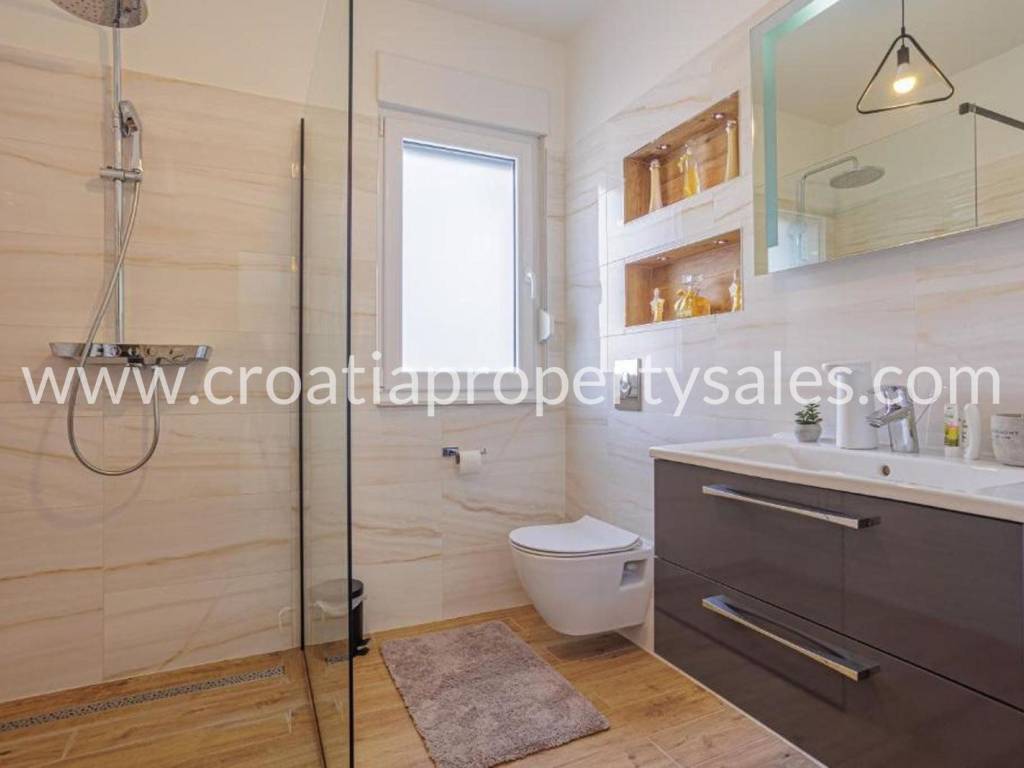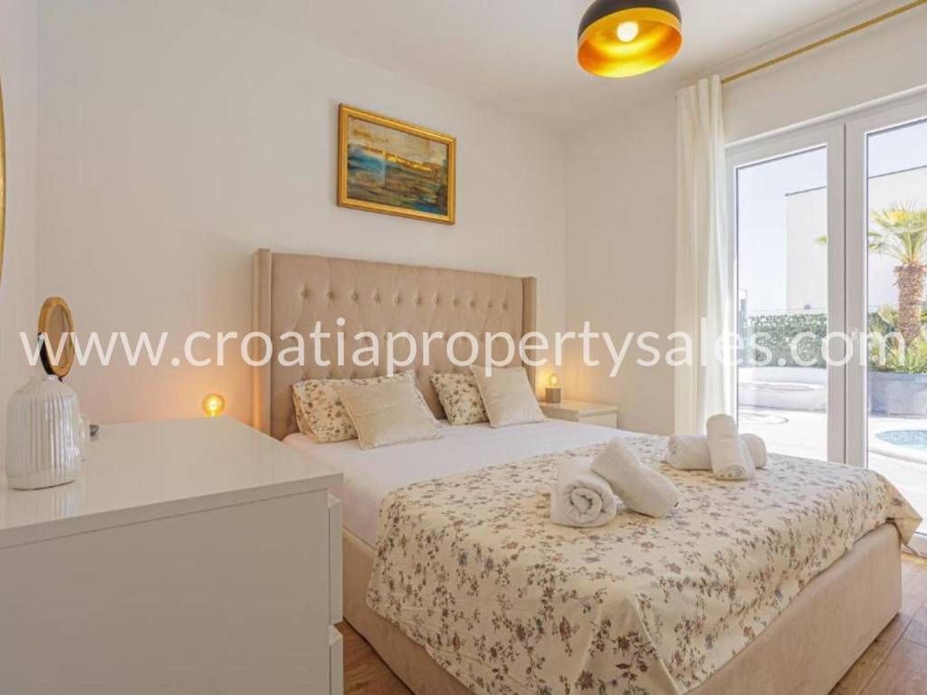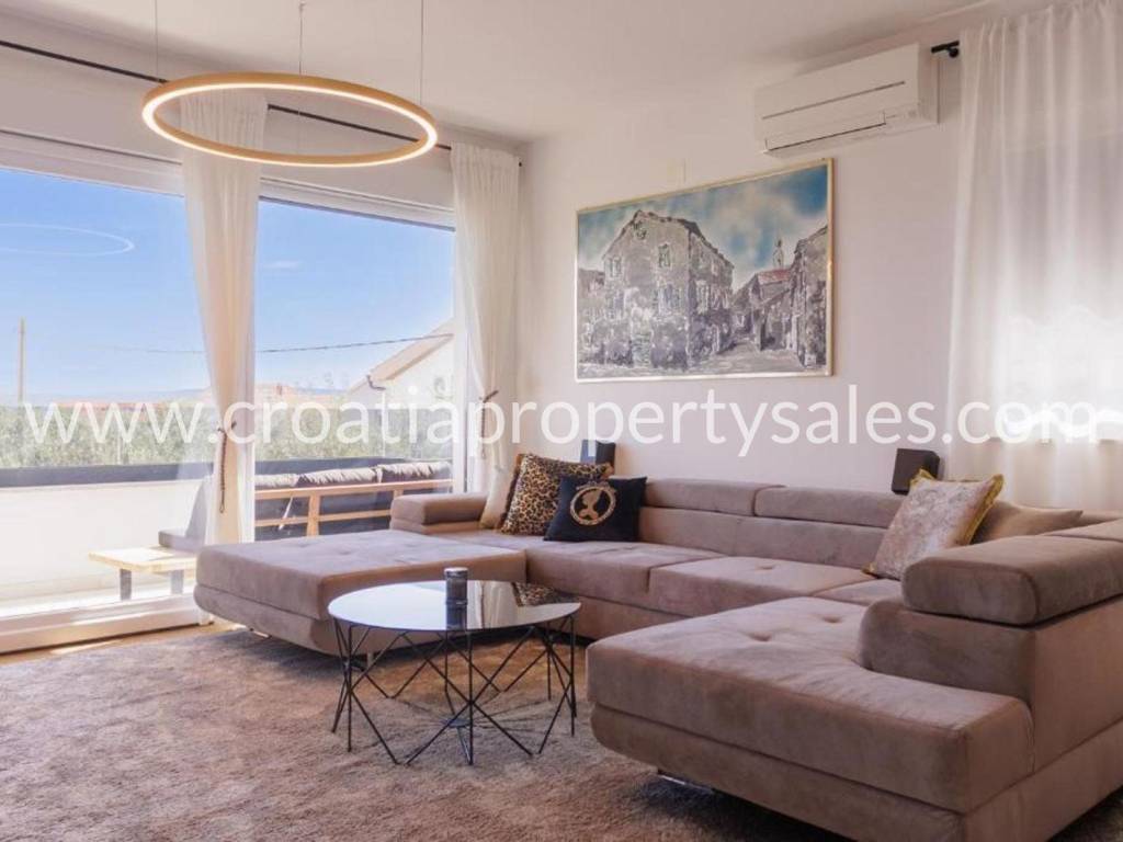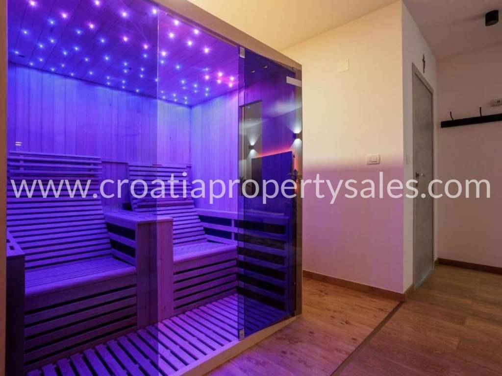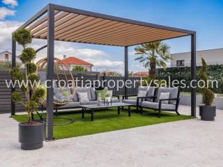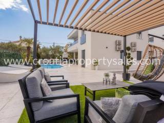 Luxury villa with pool and sea view.It is located in a quiet location just 1 kilometer from the sea.The villa has two floors with five bedrooms and four bathrooms.On the ground floor there is a large living room with kitchen and dining room that has access to the yard, pool and sundeck, and on the first floor there is a terrace with a view of the sea and the Kaštela Bay.The upper floor also has a living room with an infrared sauna.The villa also has a parking space and a charger for electric cars.