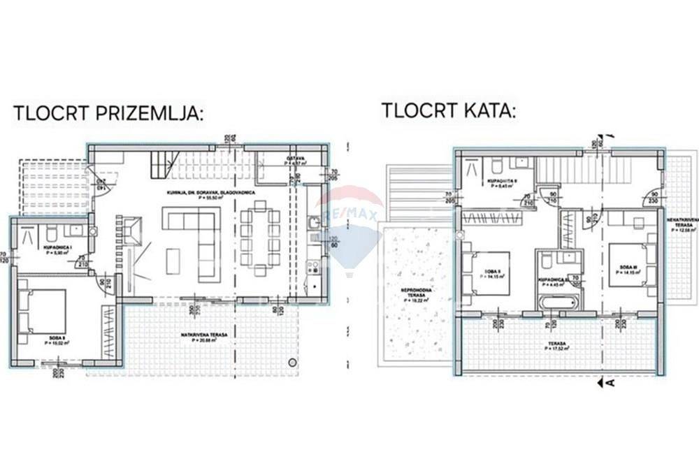On the ground floor you will find a spacious living room with kitchen and dining room (55.5 m), one bedroom, bathroom, storage room and a covered terrace (21 m).