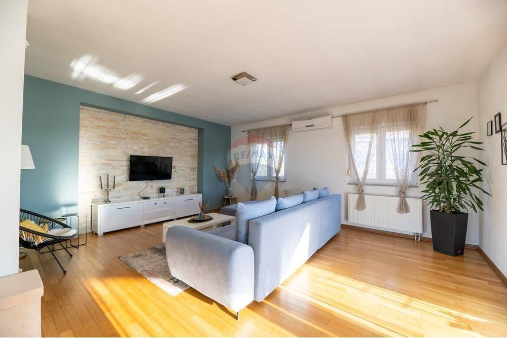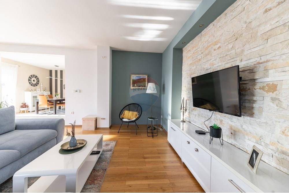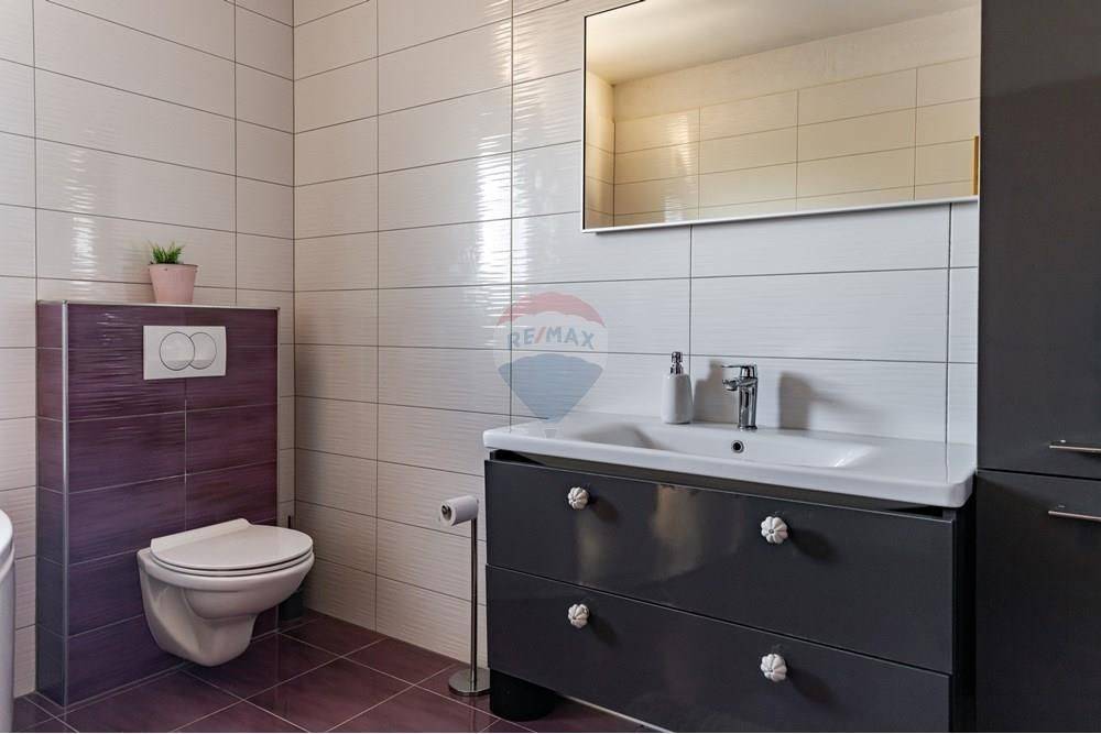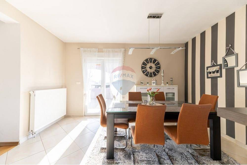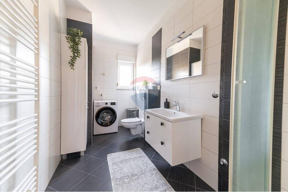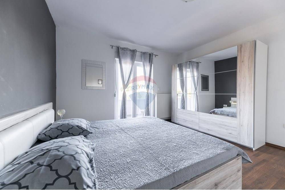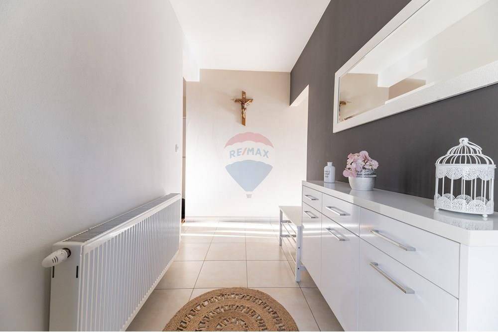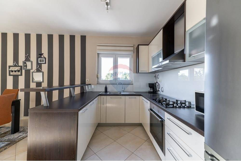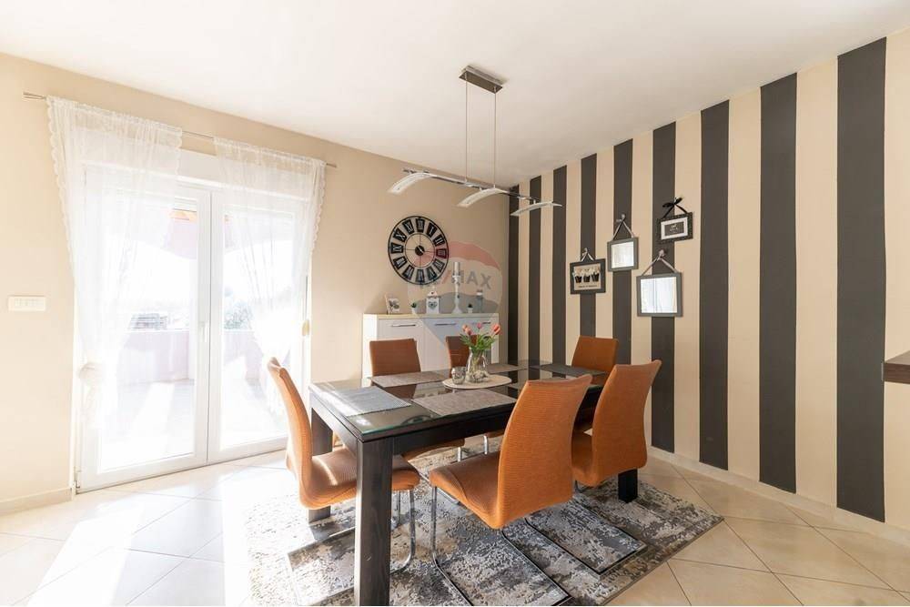 In the ground floor there is a garage and utility rooms, and on the upper ground floor a beautiful, fully furnished three-room apartment consisting of a kitchen, dining room, living room, 3 bedrooms, two bathrooms, an entrance hall and a large covered terrace.