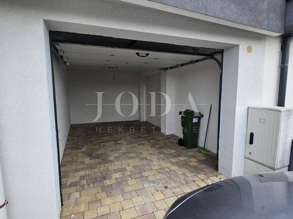 There is a large storage room on the ground floor of the building, while there is a garage next to the building and a parking space in front of it.