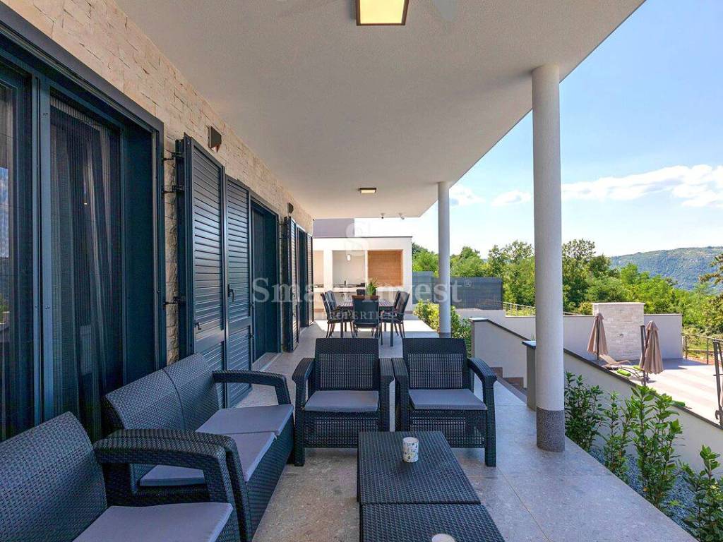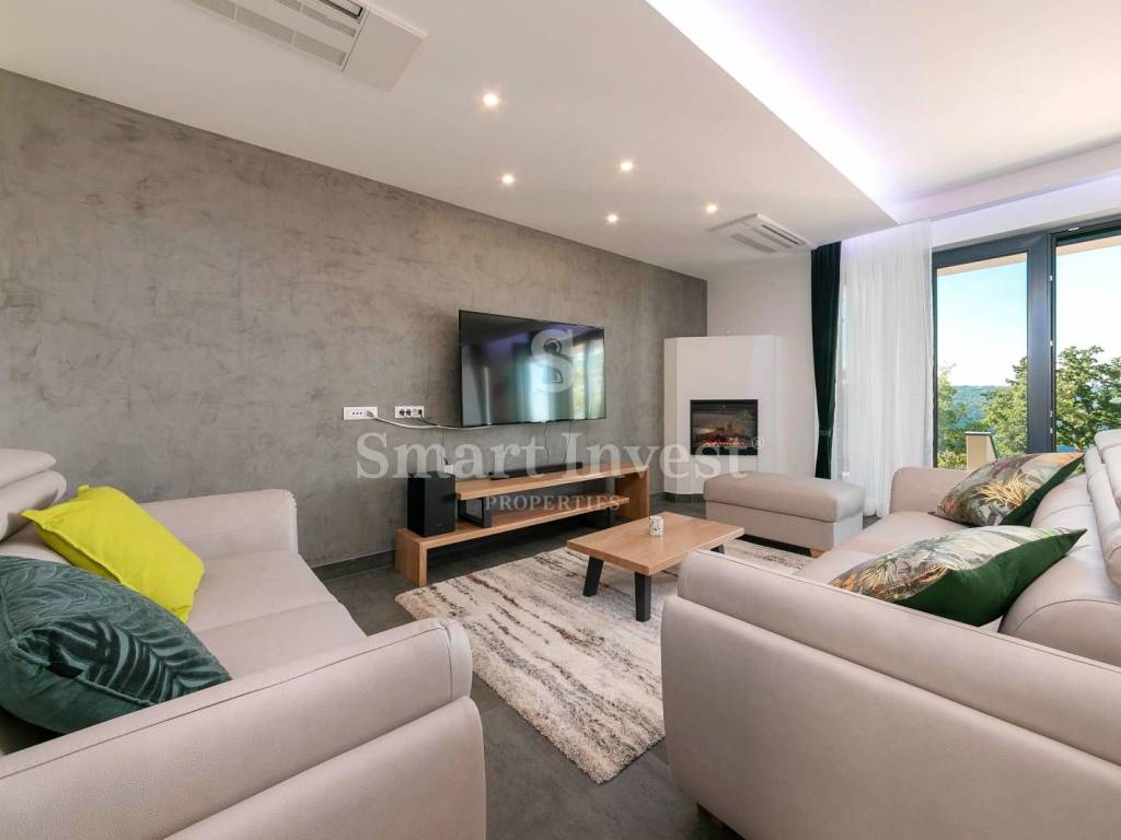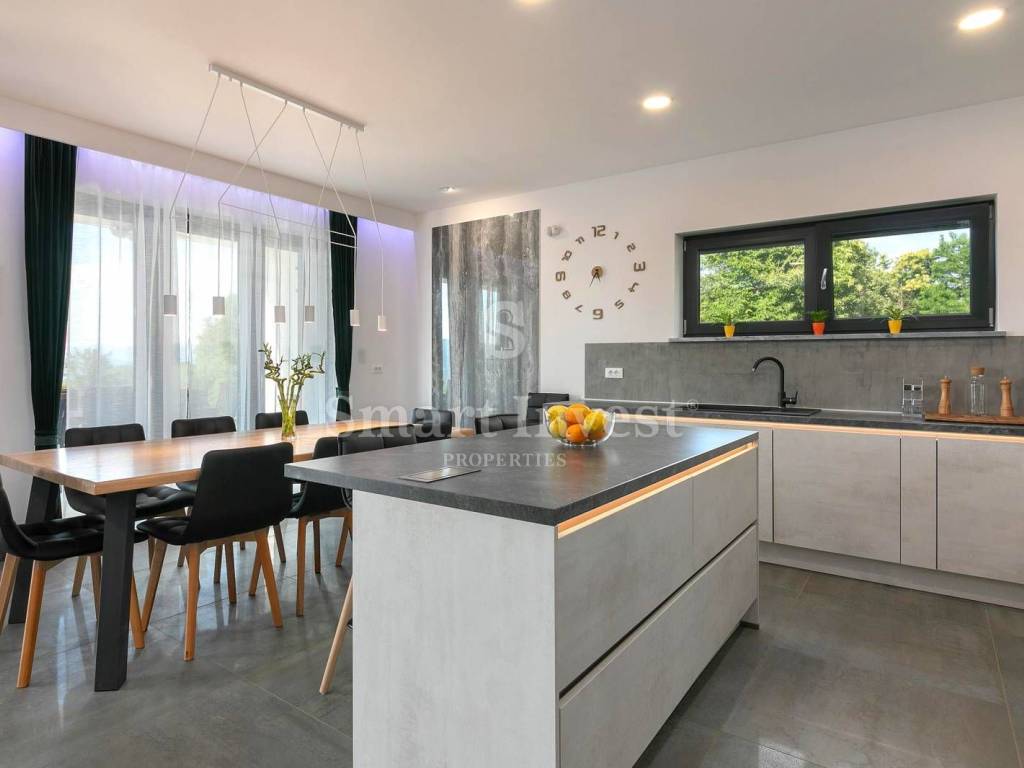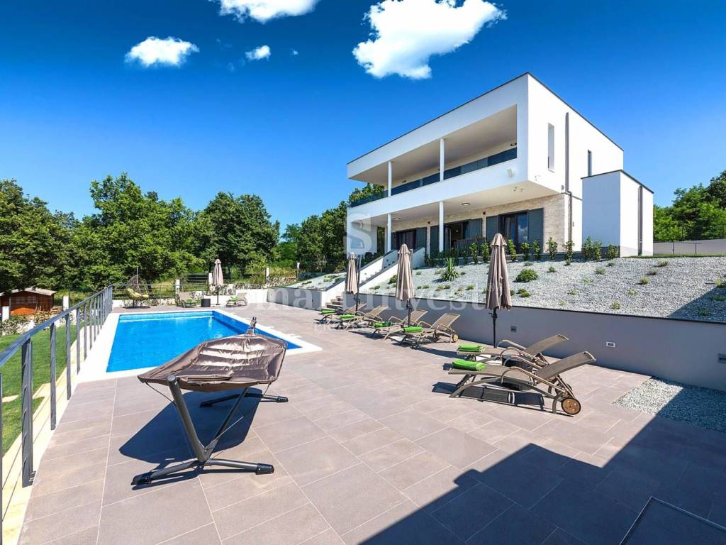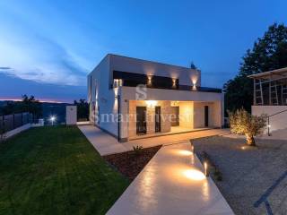 For sale is a luxury villa of modern architecture and the highest construction standard, completely furnished and equipped, in a small, picturesque Istrian village, surrounded by beautiful nature, olive trees, various fruit trees, and a vineyards. Distance from the sea and beautiful pebble beaches in Rabac 12 km.