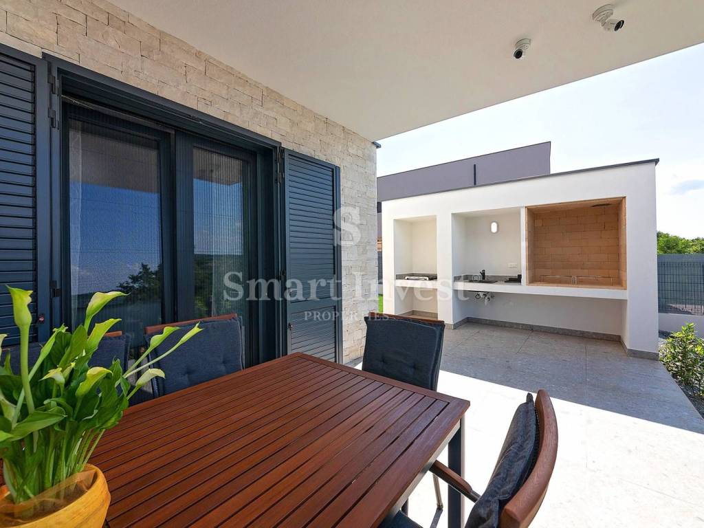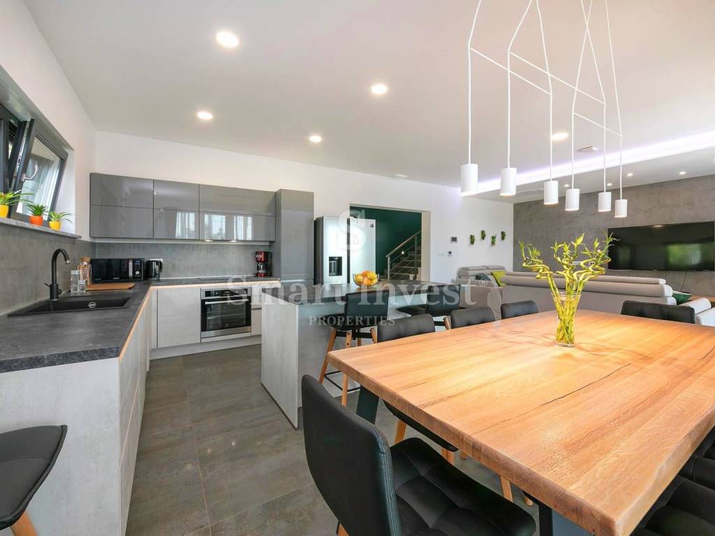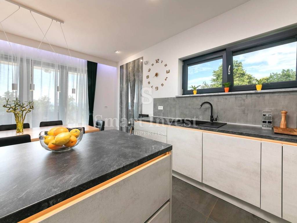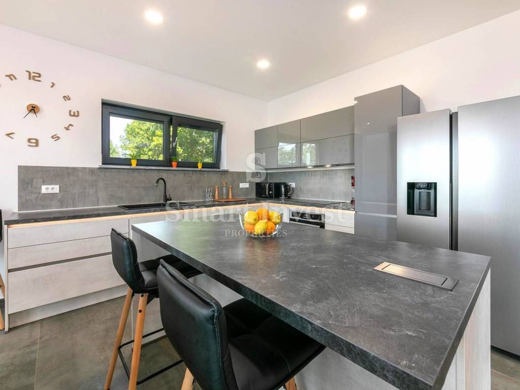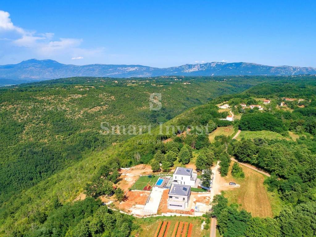 For sale is a luxury villa of modern architecture and the highest construction standard, completely furnished and equipped, in a small, picturesque Istrian village, surrounded by beautiful nature, olive trees, various fruit trees, and a vineyards. Distance from the sea and beautiful pebble beaches in Rabac 12 km.