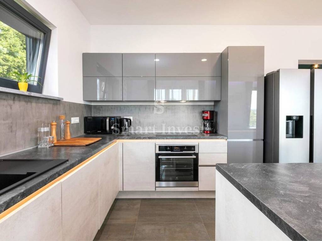 The villa was built as a low-energy building, using state-of-the-art solutions and insulation materials so that energy consumption is reduced to a minimum. Building structure, thermal insulation of facade, roof and floor, as well as the built-in carpentry ensure high energy efficiency. The interior is decorated with a lot of love, in a carefully chosen combination of natural earthy tones with sophisticated white and gray shades and is equipped with modern appliances and devices, and furniture made largely to order from the original Slavonian oak.