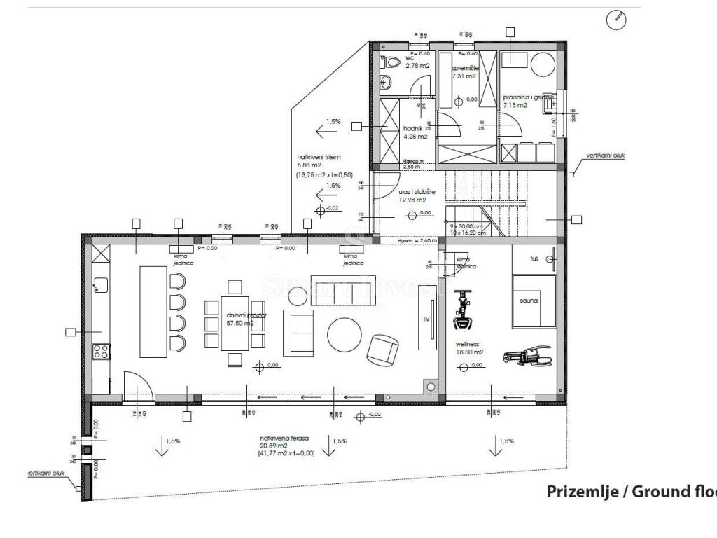 On the ground floorthere is a covered entrance, corridor, spacious living room with kitchen and dining area and access to a covered terrace, wellness with sauna and shower, toilet, laundry room, storage room.
