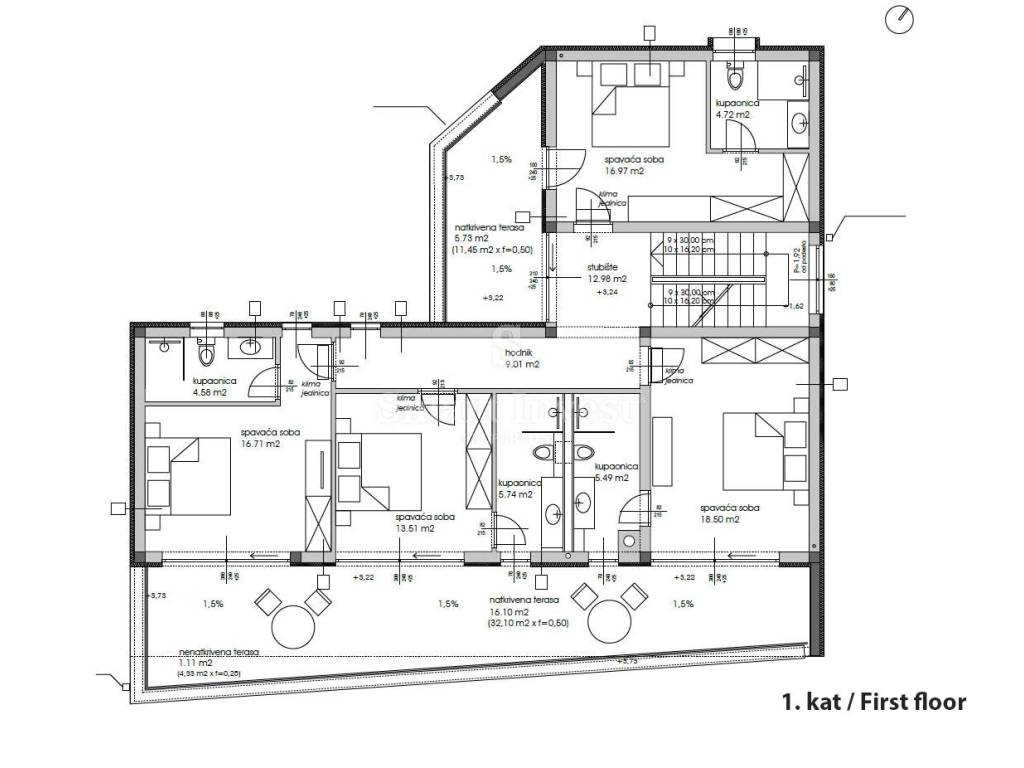 On the first floor is a corridor, 4 comfortable bedrooms with en-suite bathrooms. Three bedrooms have access to a spacious terrace with a beautiful sea view.