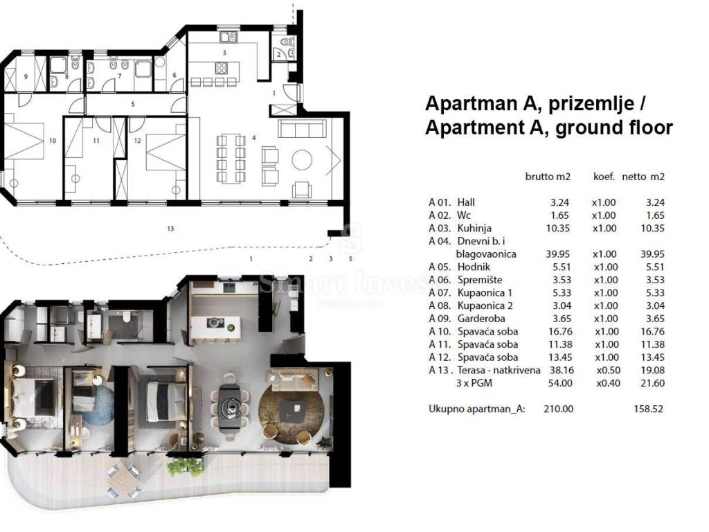APARTMENT A with a total net area of 158.52 m2 is situated on the ground floor and consists of an entrance hall, spacious living room with dining area, kitchen, master bedroom with en-suite bathroom and wardrobe, two more bedrooms with a shared bathroom, storage room, WC, spacious covered terrace of 38.16 m2 with private pool, and 3 garage parking spaces.