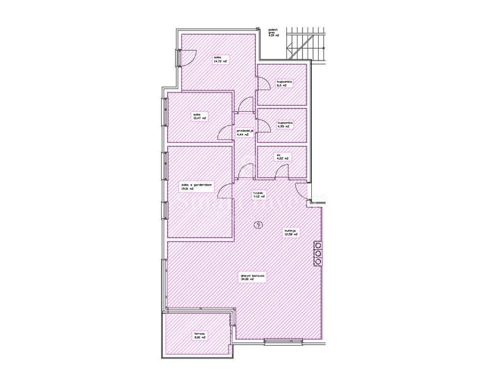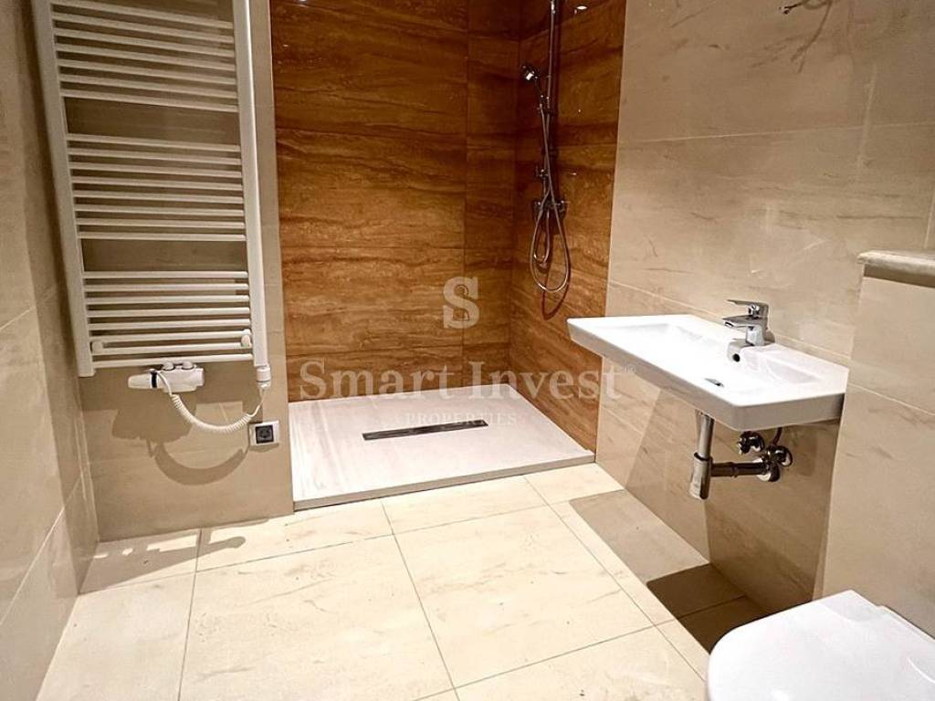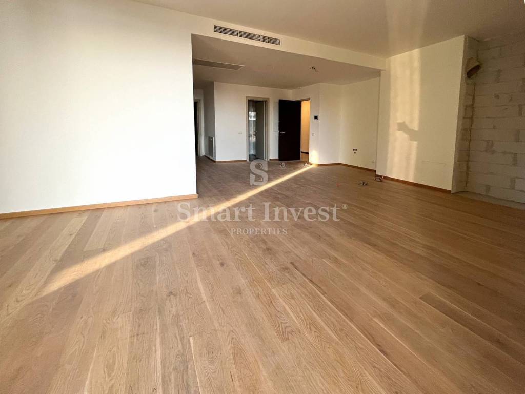 Сonsists of a corridor, living room with kitchen, anteroom, bedroom with wardrobe, two more bedrooms, 2 bathrooms, toilet (total area 120.07 m2). The apartment has also a terrace of 10.27 m2, an upper parking space P9G, a lower parking space P9D and a storage room S9 in the basement with a total area of 28.57 m2,which all together with the living area makes a gross area of 158.91 m2.