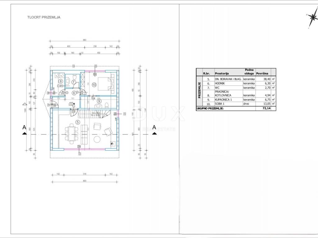 prizemlje (Dnevni dio): Prostrani Dnevni boravak/Blagovaonica/Kuhinja, spavaća soba 1, kupaonica 1, WC, Kotlovnica/Praonica i natkrivena terasa.