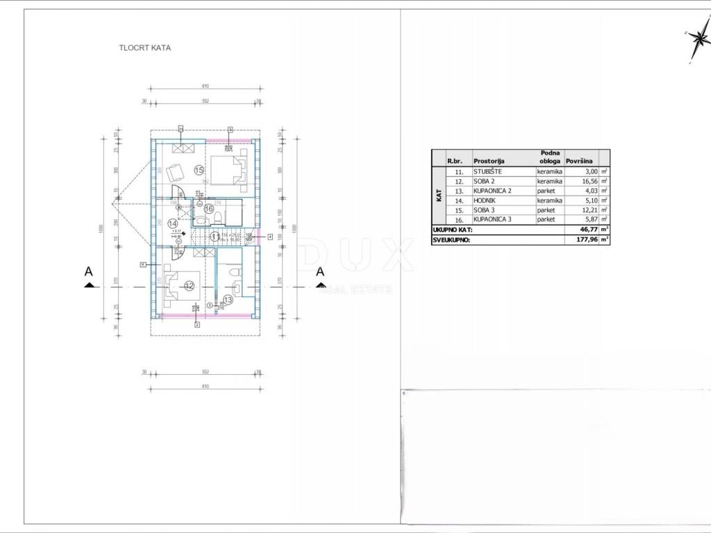 kat (Spavaći dio): Hodnik, Spavaća soba 2 s kupaonicom 2, Spavaća soba 3 s kupaonicom 3 i natkriveni balkon.