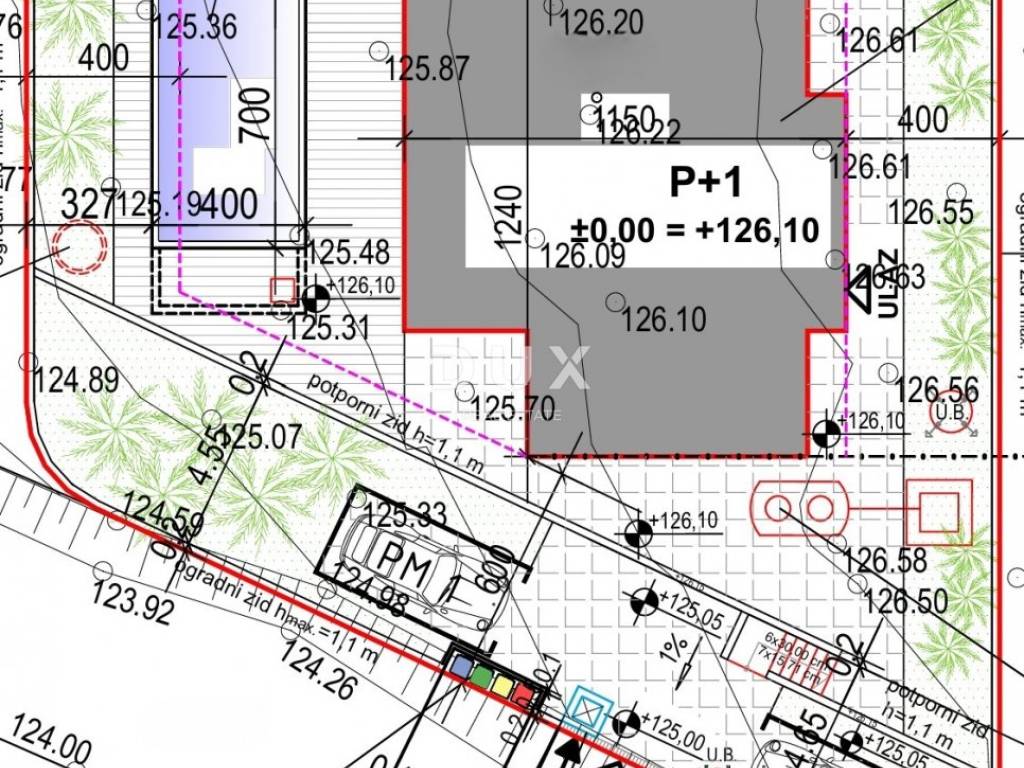 Zemljište je konfiguracijski pretežito ravno, što omogućuje prirodnu integraciju objekta i pruža brzi početak građenja bez pripremnih radova. Pogled na more s kata buduće vile. Okruženo je novogradnjama i zelenim površinama, što jamči mir i privatnost, a ujedno blizinu svih potrebnih sadržaja.