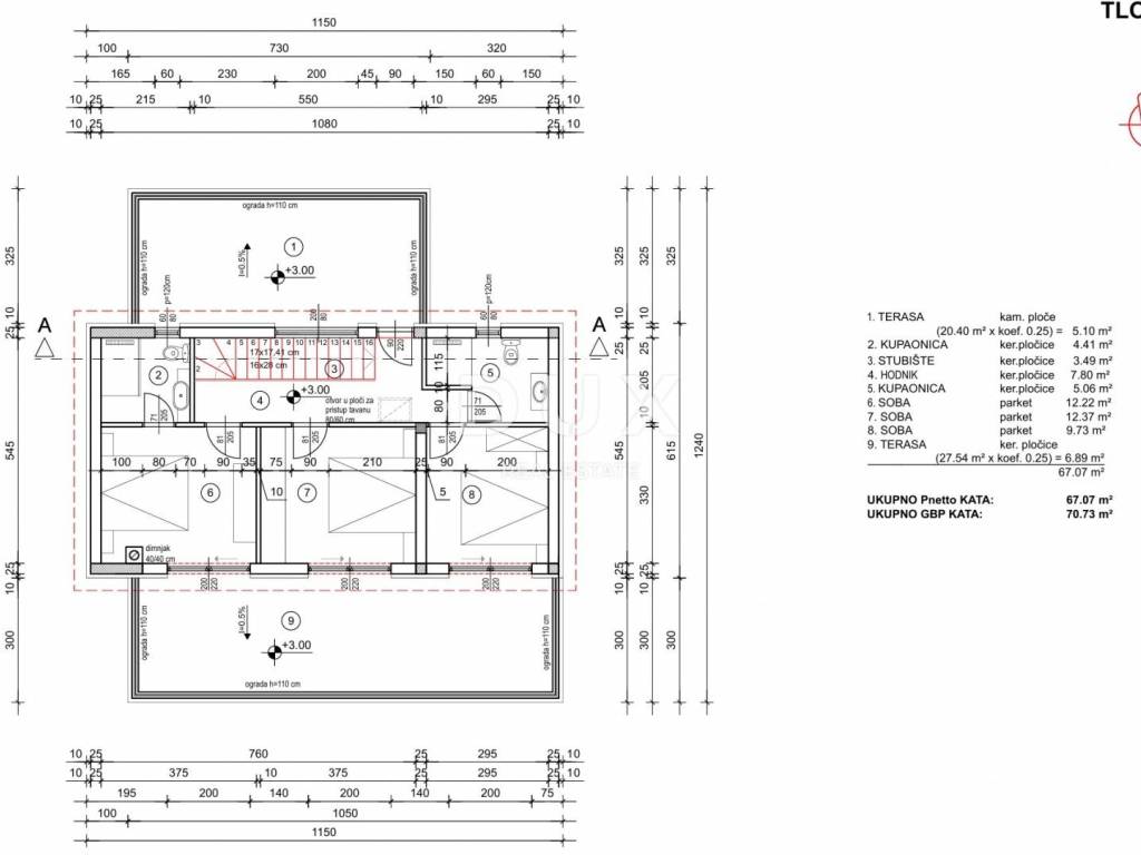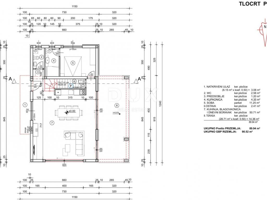 --> Prizemlje (GBP 90,50 m) sastoji se od ulaza, wc-a, predsoblja, kupaonice, jedne sobe, ostave, prostranog open space dnevnog boravka s kuhinjom i blagovaonicom, terase te stubišta.