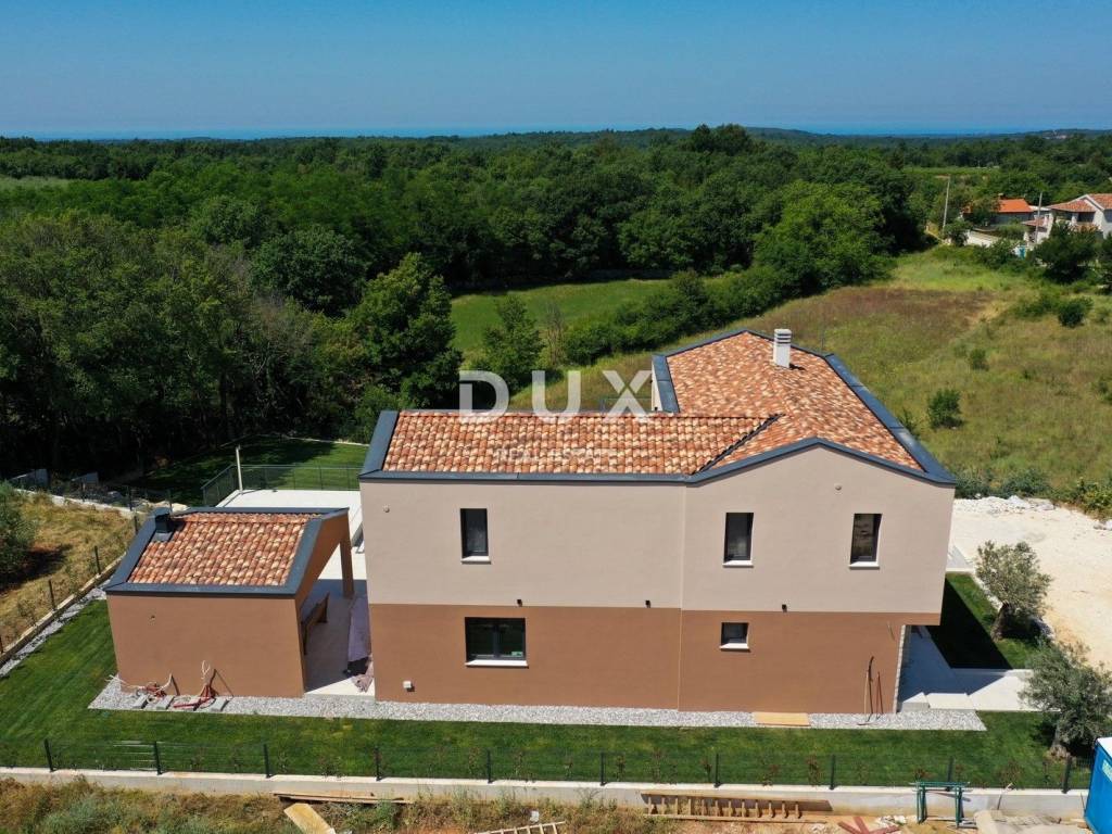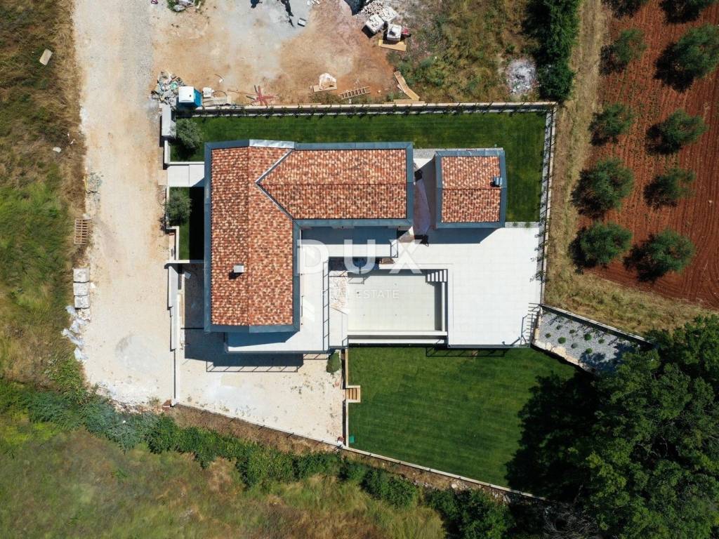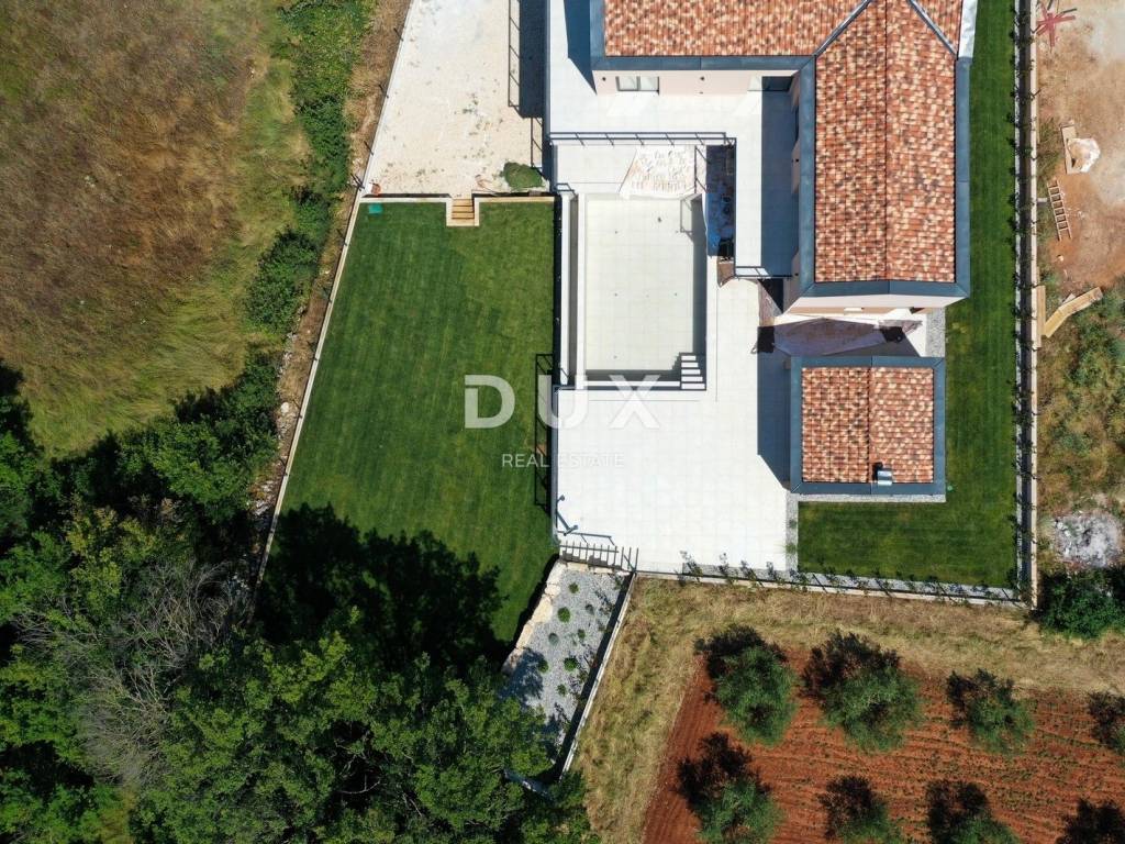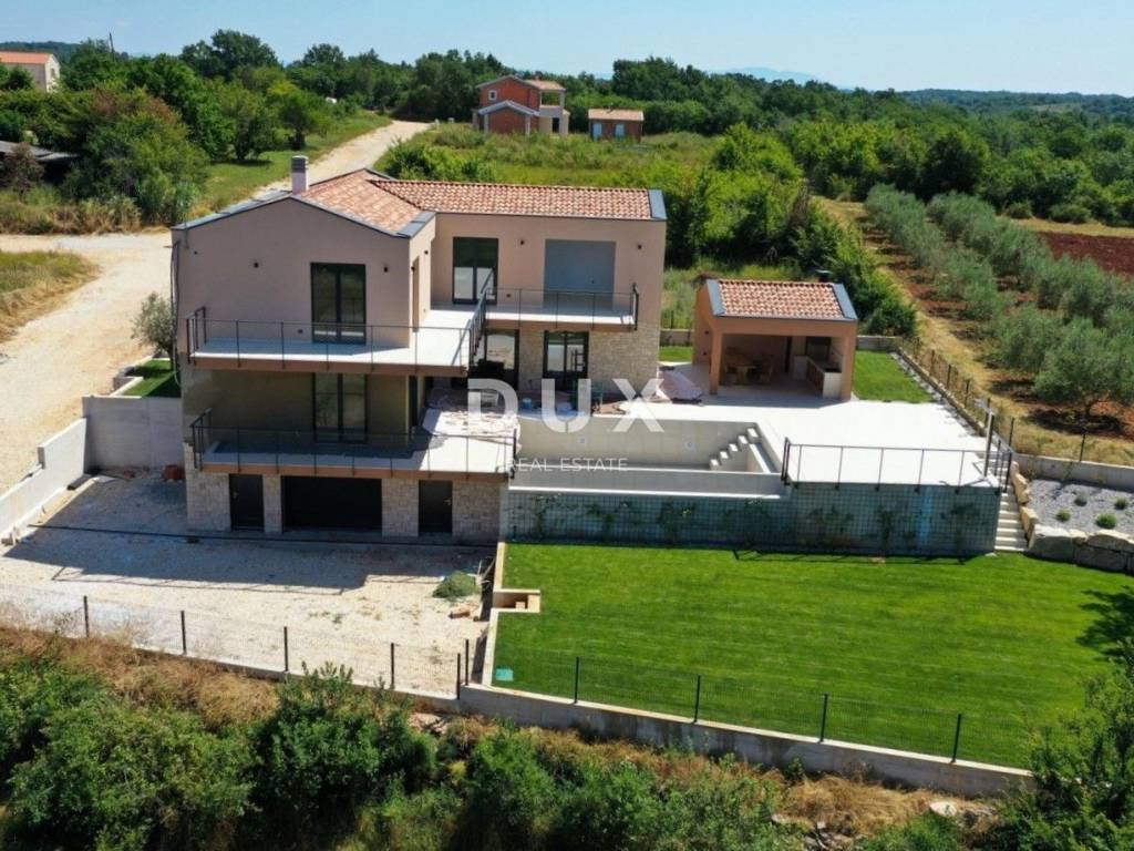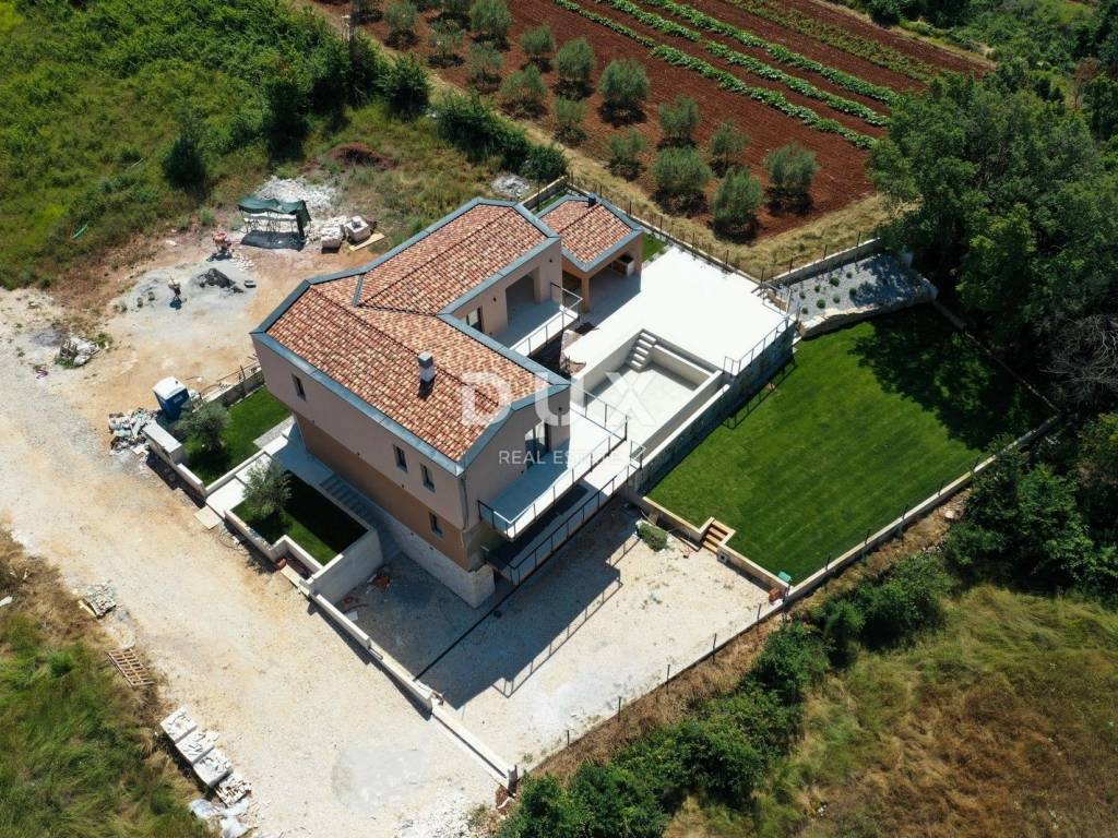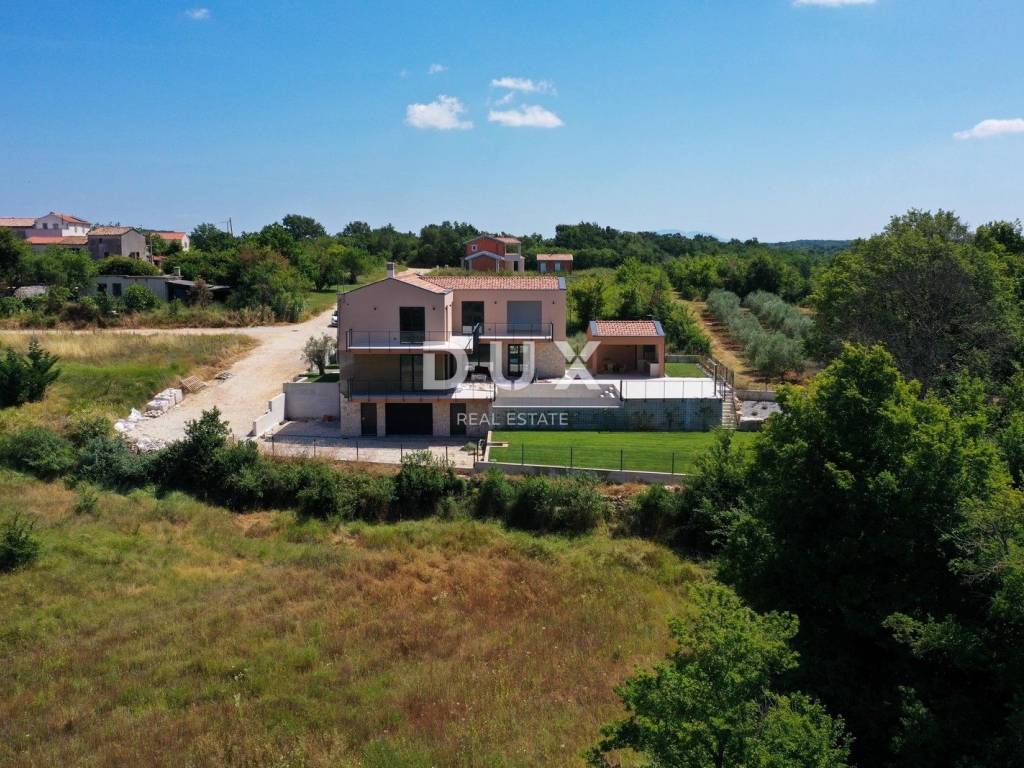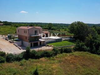 Višnjan is a picturesque and lively town and municipality in the western part of Istria. The municipality of Višnjan has 56 settlements and is located in the area between the Mirna River in the north and the Lim Channel in the south. Romantic Višnjan is situated on a gentle hill of 244 m above sea level surrounded by meadows, arable land and forests of holm oak and white hornbeam. Today, Višnjan is best known for its unique observatory, which is one of the twelve most productive observatories in the world of all time in terms of the number of asteroids discovered. In the idyllic landscape around Višnjan, a house with a swimming pool on the edge of the village is for sale. The microlocation offers an authentic experience of a small Istrian town, intimacy and relief from every hectic effort and noise, while at the same time being close enough to dynamic Istrian cities with a range of facilities. A comfortable house of timeless charm and architecture, partly clad in stone, blends in with the settlement and landscape in terms of form and color, and the quality of construction guarantees long-term satisfaction and quality of living. It is designed as a single residential unit that combines elegance, functionality and comfort across three floors. The basement consists of a garage, a multi-purpose room intended as a social area, a billiard room, a gym or wellness area, technical rooms and a swimming pool engine room. The ground floor consists of a kitchen with a dining room, a living room, a bedroom with a private bathroom and a guest toilet. The first floor consists of a hallway, a storage room and three bedrooms with private bathrooms, all of which have access to a balcony. The yard is ambientally and horticulturally decorated and fenced, and the perfect harmony is rounded off by additional facilities such as an auxiliary building containing a summer kitchen with a toilet and a swimming pool with a sunbathing area. The excellent location and spatial organization of the interior and exterior of this property provide an opportunity for a comfortable family life or an investment in a tourist rental business. The seller of the property in question is a legal entity and VAT is included in the stated price.