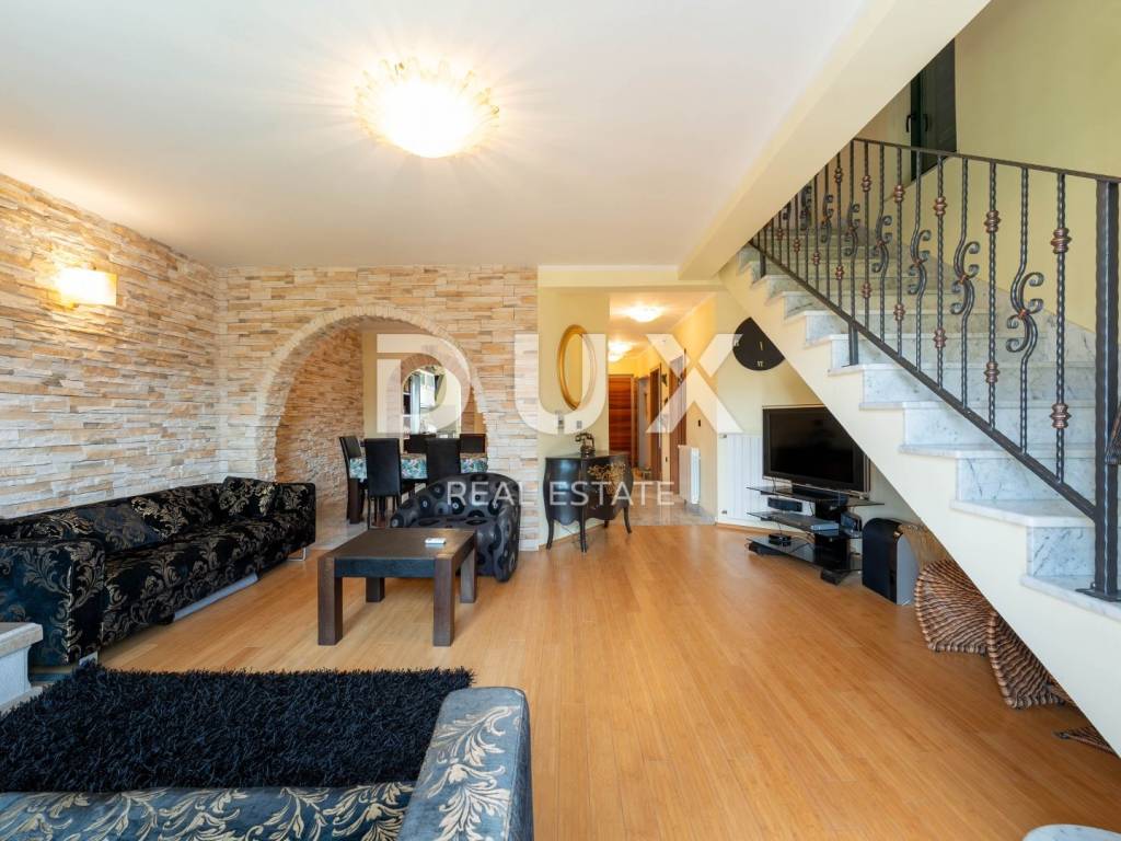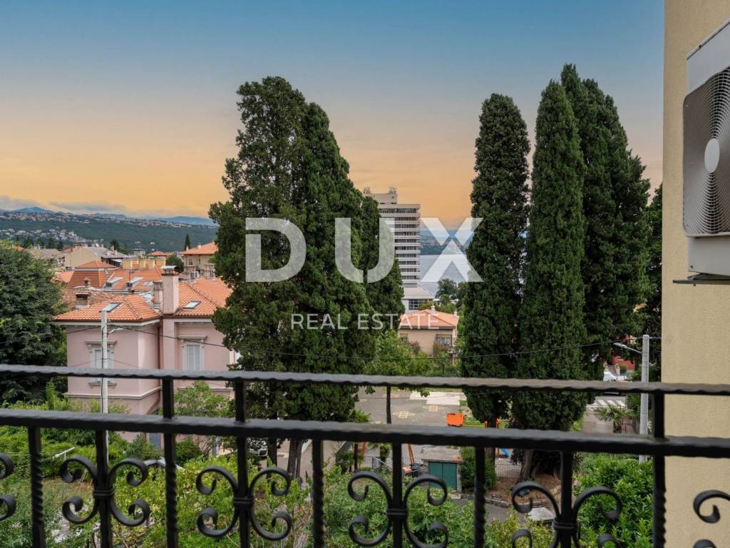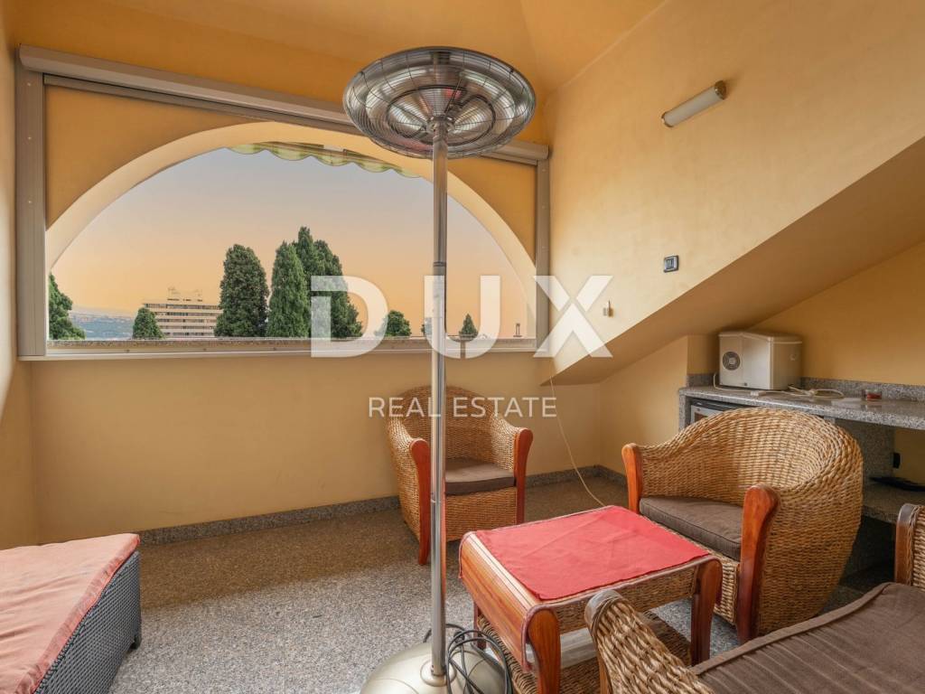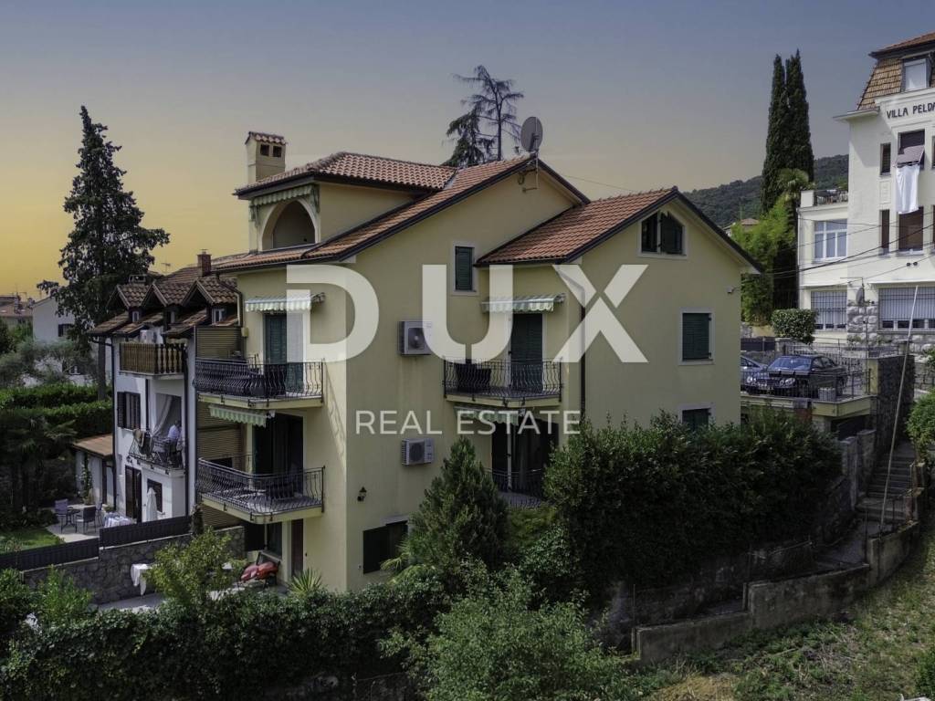 We present to you this semi-detached villa in the center of Opatija located in the peaceful surroundings of Opatija Villas, just a two-minute walk from the sea. The villa is architecturally impressive and extends over four floors, providing an excellent layout for comfortable family life and relaxation. Basement: In the basement there is a small, charming studio apartment of 23m2 consisting of a bathroom, a bedroom and a small kitchenette with a dining area. In front of the entrance to the apartment there is a large terrace for relaxation. Ground floor: On the ground floor there is a beautiful two-bedroom apartment of 83m2 consisting of an open space area that combines a kitchen with a dining area and a living room with a tiled stove, two bedrooms and a bathroom. The southern orientation of the living room ensures plenty of natural light and an unobstructed view of the sea. The living room opens onto a terrace, and one room onto a balcony. 1st Floor: On the first floor there is a beautiful two-storey apartment of 155m2. The lower floor consists of an open space area that combines a kitchen with a dining room and a living room with a beautiful fireplace, a bathroom with a hydromassage shower and two bedrooms. On the upper floor there are two bedrooms ideal for guests or children and a bathroom with a bathtub. The southern orientation of the living room on the ground floor and on the first floor ensures plenty of natural light and an unobstructed view of the sea. The living room on both floors opens onto a large terrace with a stunning view of the sea. The entire villa has electric central heating and is air-conditioned in the bedrooms and living room, providing maximum comfort throughout the year. The spacious and fenced garden includes a private pedestrian and private entrance for parking for two vehicles and a space for socializing with a large barbecue. This villa offers the perfect balance between privacy and comfort, in a quiet environment away from the noise of the city, but close to all necessary amenities and the beautiful Adriatic Sea.
