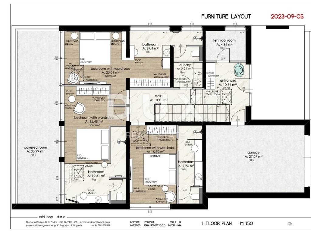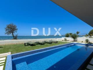 We are selling a beautiful villa under construction right on the beach. It consists of two floors and an organized garden. On the ground floor there are living rooms, rooms for household maintenance, a garage for two cars, a sunbathing area, a swimming pool and other facilities for daily activities. Private rooms are located on the first floor; 4 bedrooms with private bathrooms with access to a large balcony with a wonderful view of the sea. The house has a smart management system, which makes it easier to maintain the property and enjoy it more comfortably. Sisem Loxone Smart Home can be controlled via a switch, smartphone, tablet (remote access) or computer. The villa is equipped with a heat pump for heating and cooling with high energy efficiency and contributes to the great comfort of living. The internal heating and cooling units of the facility are placed in the suspended ceiling, which improves the visual identity of the facility's interior. Domestic hot water is also heated by a heat pump. This system contributes to the high energy efficiency of the villa itself, thus protecting the environment. In the garden there is an overflow heated pool. The pool is heated by a heat pump that is independent of the heat pump for heating and cooling the building.