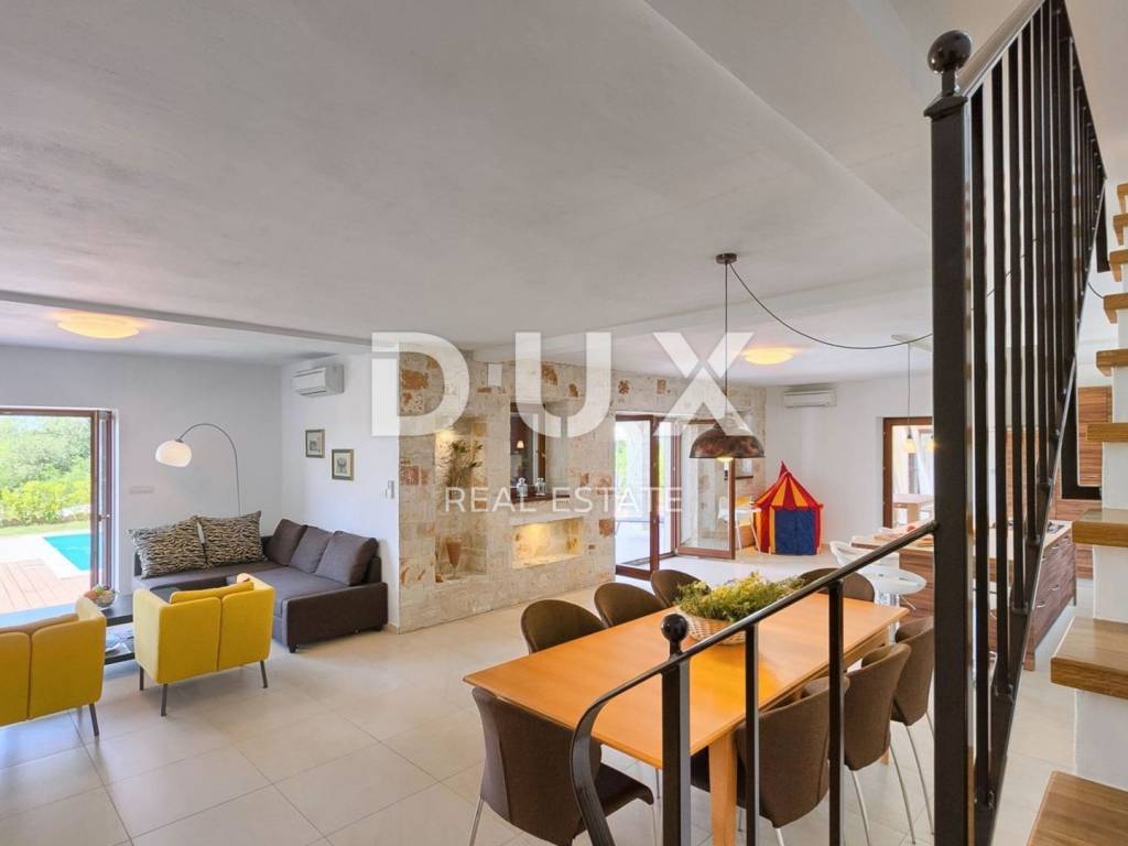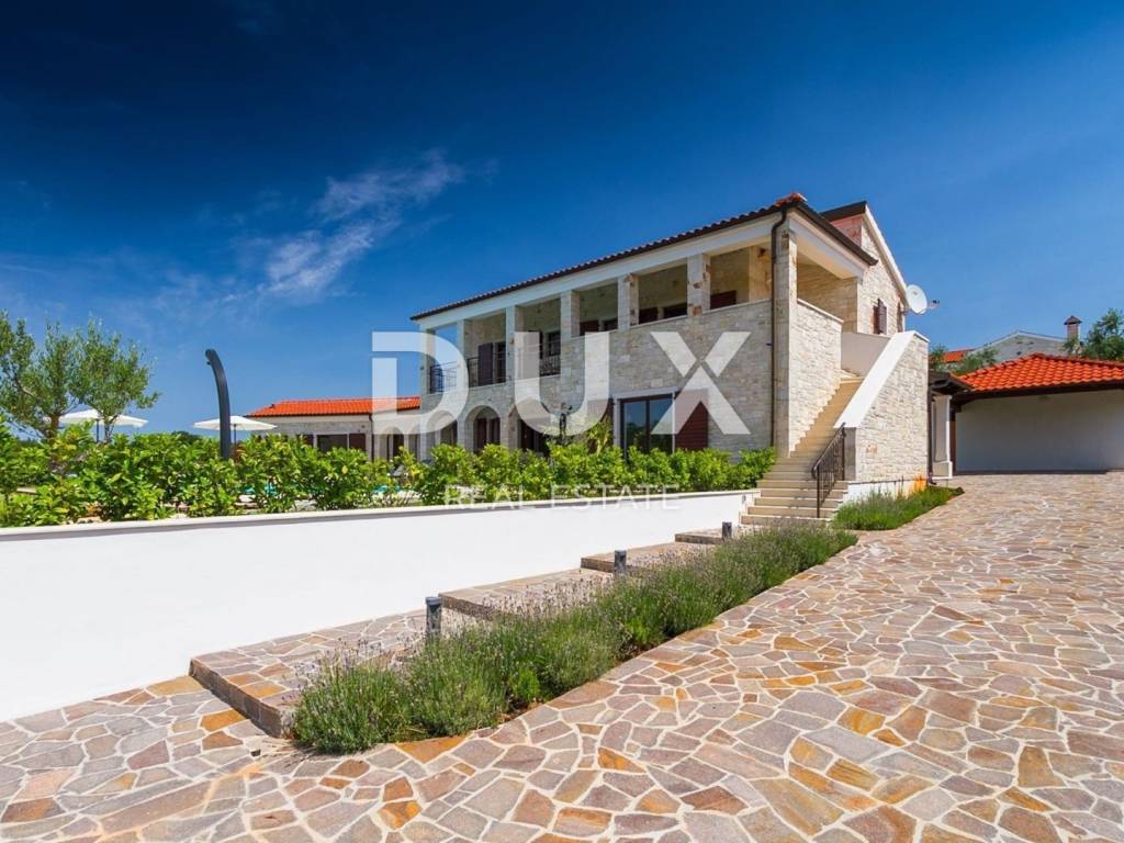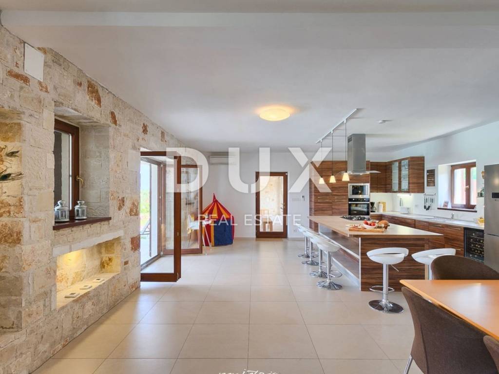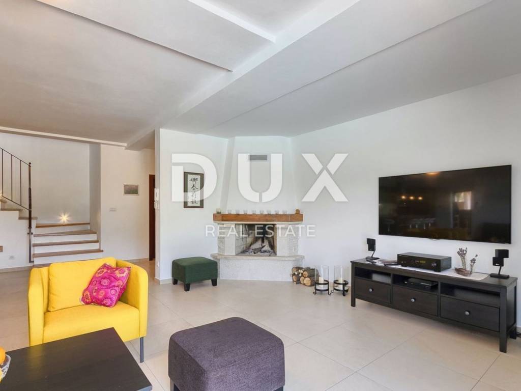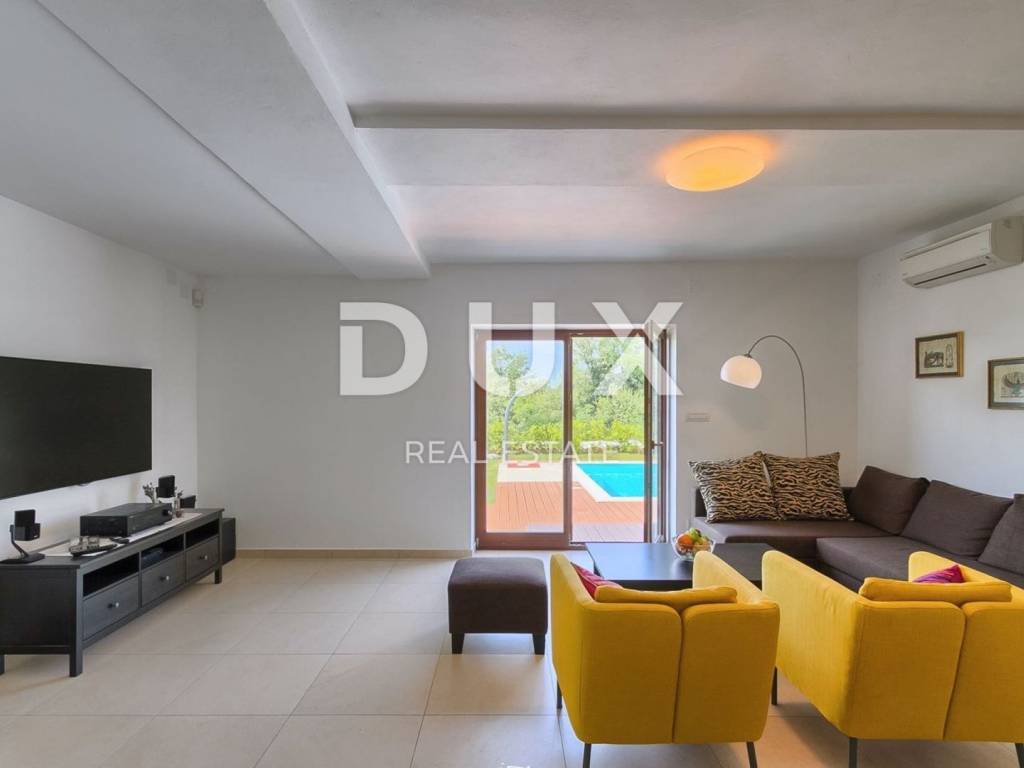 On a hill with a beautiful view of gentle fields, vineyards, olive groves and the sea in the distance lies Sveti Lovreč. Sveti Lovreč is located amidst lush lavender fields in the western part of the Istrian peninsula, in the immediate hinterland of Vrsar, Poreč and Rovinj, and is one of the best-preserved medieval fortified towns in Istria. The location of the town on a gentle hill that dominates the area where as many as 22 settlements, villages and hamlets are scattered speaks of its significant role throughout history. Along the gently indented western coast of Istria, several deep bays stand out, of which Lim Bay is partly located within the Municipality of Sveti Lovreč. Lim Bay is a natural phenomenon of great scientific and aesthetic value; it has been declared a special marine reserve. Surrounded by greenery in a gentle neighborhood near Sveti Lovreč, a villa with a swimming pool is available for long-term rental. The microlocation offers an authentic experience of a small Istrian town, intimacy, relief from every hectic effort and a break from noise, while also being close enough to the dynamic cities of Istria with a range of amenities. In addition to the convenient location, the property is also characterized by the quality of construction, which guarantees long-term satisfaction and quality of living. The house, completely clad in stone, is a perfect blend of traditional and modern and is designed as one residential unit that extends over two tastefully decorated and well-equipped floors. The ground floor of the house consists of an open-concept space that unites the kitchen, dining room and living room with access to a covered terrace that contains an open fireplace, bedrooms with private bathrooms, a guest toilet and a storage room. The first floor consists of two bedrooms with private bathrooms and a covered terrace that offers a panoramic view of the surroundings. The yard is ambientally and horticulturally decorated and fenced and contains a swimming pool with a sunbathing area. The excellent location and spatial organization of the interior and exterior of this property provide an opportunity for comfortable family life.