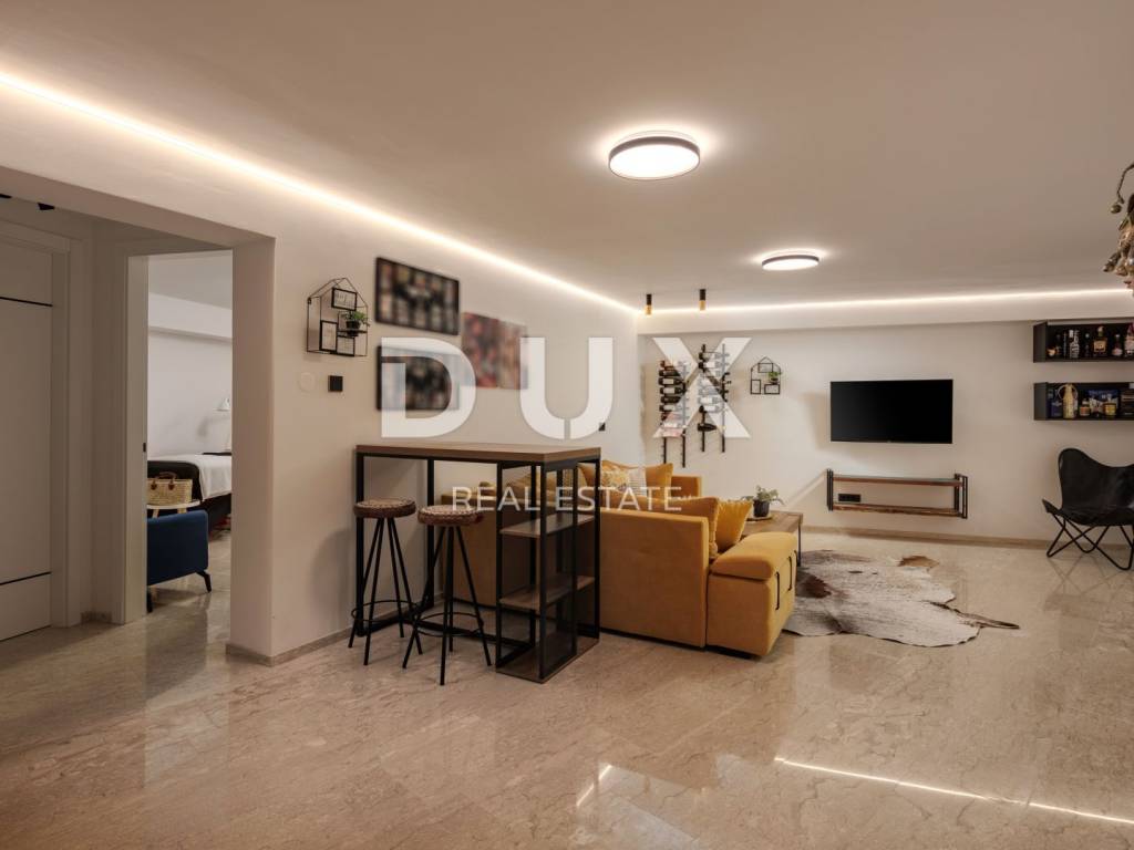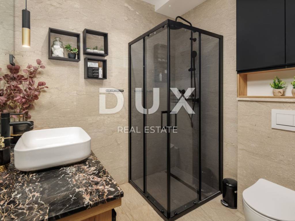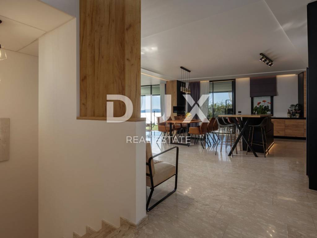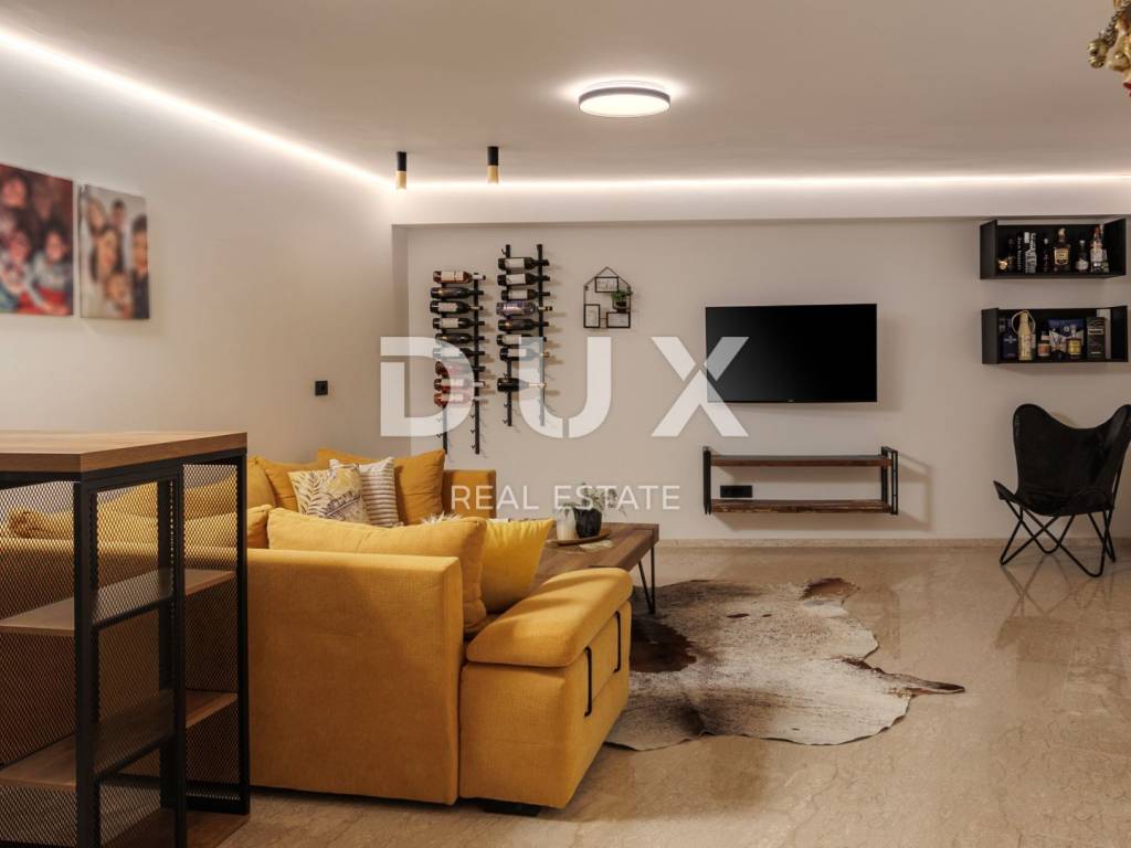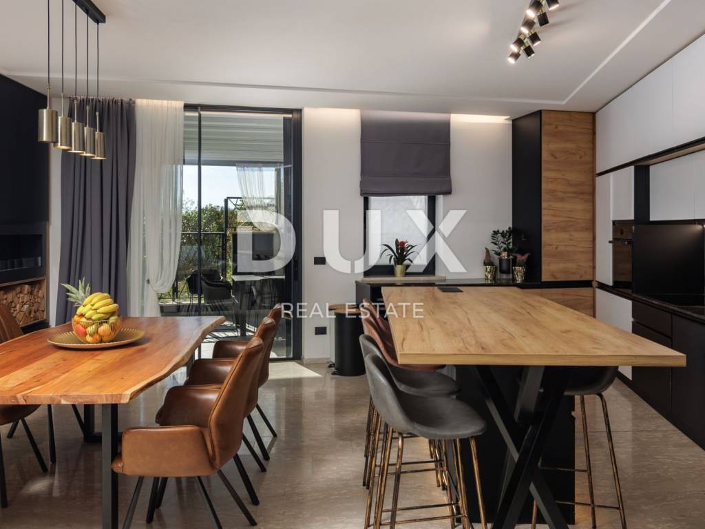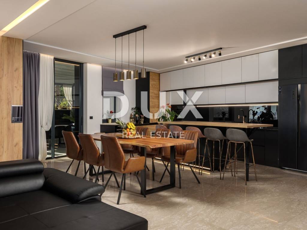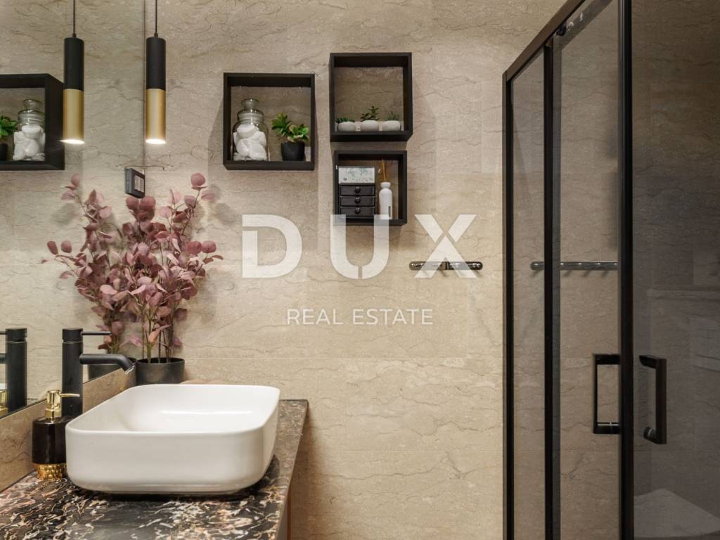 For long-term rental, an exclusive floor in a special new building above the center of Opatija, measuring 294 m, with a panoramic view of the Kvarner Bay, a spacious terrace, a private garden and a garage is available. This luxurious and modernly decorated residence is located in a south-oriented new building and offers top comfort with additional amenities such as a tavern, sauna, recreation area and storage room. It is only 400 meters as the crow flies from the sea, while offering peace and privacy. The floor extends over the entire high ground floor of a contemporary building and offers spaciousness rarely available on the rental market. It consists of four elegantly decorated bedrooms, three modern bathrooms (one of which is en suite with a walk-in shower in the master bedroom), and a spectacular open-space living room measuring 80 m, which includes a kitchen and a dining room. The entire space has direct access to a covered terrace with a beautiful sea view. Thanks to large sliding doors, the interior is flooded with natural light, further emphasizing the feeling of spaciousness and luxury. The kitchen, designed with an emphasis on functionality and aesthetics, is as long as 9 meters and includes a large island and all necessary appliances. The living room is equipped with modern and comfortable furniture, perfect for relaxing or socializing. The entire space exudes sophistication with the use of top-quality materials such as the exclusive "Nero Portoro" and "Royal" stones, which are implemented in the floor and wall coverings of the kitchen and bathrooms. The exterior of the apartment includes an elegantly decorated terrace with a summer kitchen and an outdoor table, covered with three automated pergola awnings, allowing you to enjoy spectacular sea views throughout the year. In addition to the main rooms, the apartment also has a study with a wine bar and laundry room, as well as additional spaces in the basement - a wine cellar, sauna, fitness area and storage room. Underfloor heating with a heat pump ensures a comfortable temperature throughout the year, while all rooms are air-conditioned and equipped with a smart management system. Thermostats in each room allow precise temperature control according to personal preferences. Security is at the highest level thanks to the alarm system and video surveillance. The property offers plenty of parking spaces four in total, including two in the garage. This is a rare opportunity for long-term rental of a luxury property in one of the most desirable locations in Opatija, offering the perfect combination of exclusive design, spaciousness and panoramic sea views. For more information and an agreement about the rental, please contact us.