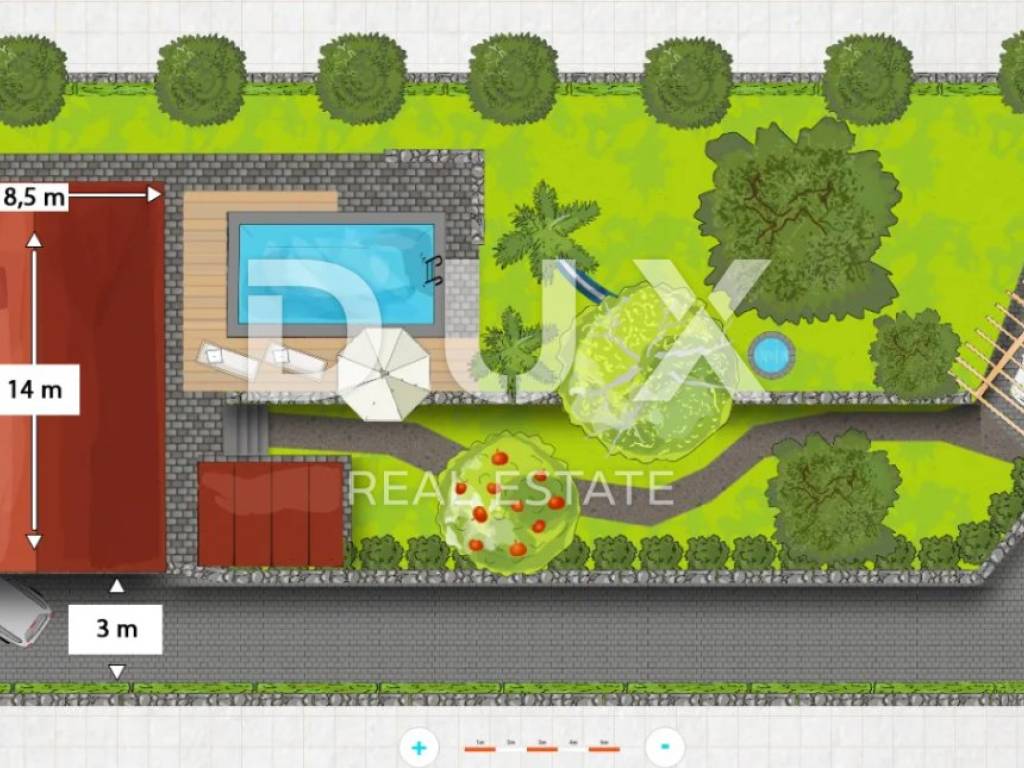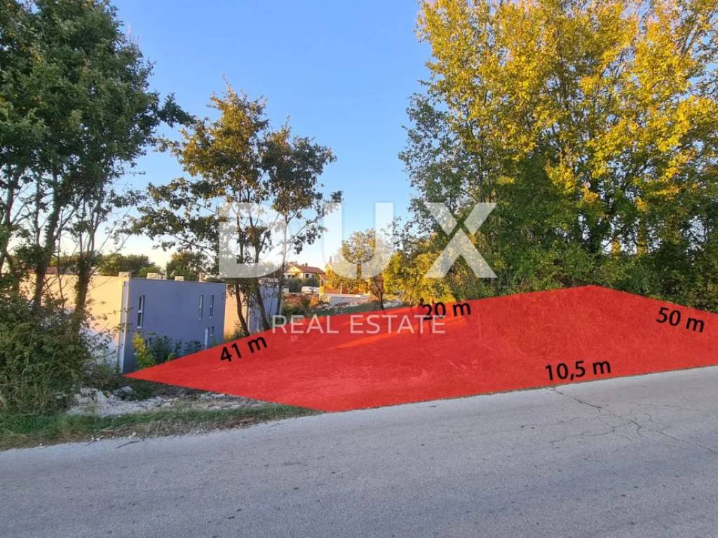 Prostrano građevinsko zemljište ukupne površine 980m2. Pravilnog je oblika te su dimenzije zemljišta 20m x 50m. Zemljište ima maleni nagib te je ograđeno s dvije strane, donja i stražnja strana (betonski zid) dok se s gornje strane nalazi mali tradiocionalni kameni zid te prirodna ograda u vidu stabala čempresa. Kako se nalazi na povišenom terenu, ima slobodan pogled prema istoku i jugu dok je prema zapadu slična situacija, no nešto manje otvorenija nego na drugim stranama. Voda i struja se nalaze odmah do samog zemljišta.