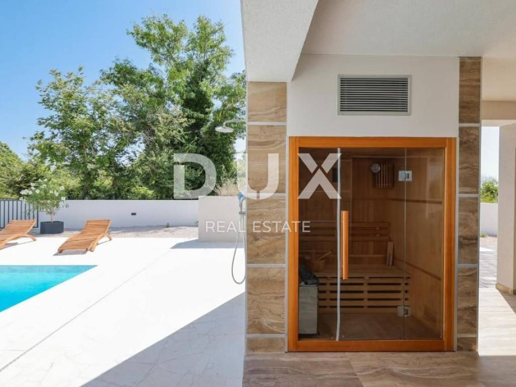 A new modern villa with a swimming pool and sauna for sale, located in a peaceful natural environment In a beautiful natural setting, this newly built modern villa, two floors, represents a combination of luxury, functionality and comfort. Located in a peaceful environment, it is ideal for relaxing and enjoying privacy, away from the hustle and bustle of the city. The yard is designed for easy maintenance and offers the perfect place for relaxation and socializing. The pool is surrounded by a sunbathing area and the yard is equipped with an outdoor toilet, shower and storage and certainly ensures ultimate enjoyment during warm days. Also, preparations have been made for installing a jacuzzi, providing additional opportunities for relaxation. The villa spreads over two floors and is designed according to modern standards: The ground floor of this villa is designed as a comfortable and spacious living area. The kitchen, dining room and living room are connected in an open-space concept, with access to a covered terrace that is ideal for relaxing and enjoying the outdoors. In addition to the main bathroom, the ground floor also offers an outdoor guest toilet and practical storage for organizing household items. On the first floor there are three bedrooms, each with its own bathroom. The rooms are decorated to provide maximum comfort and privacy, making them the perfect place to relax. This luxury villa was built according to high construction standards and equipped with top quality materials. External PVC carpentry with three-layer glass, electric blinds and mosquito nets provide additional security and comfort. The heating system includes floor heating and Inverter air conditioners, ensuring an optimal temperature throughout the year. This property represents the perfect combination of modern design, quality and natural surroundings.