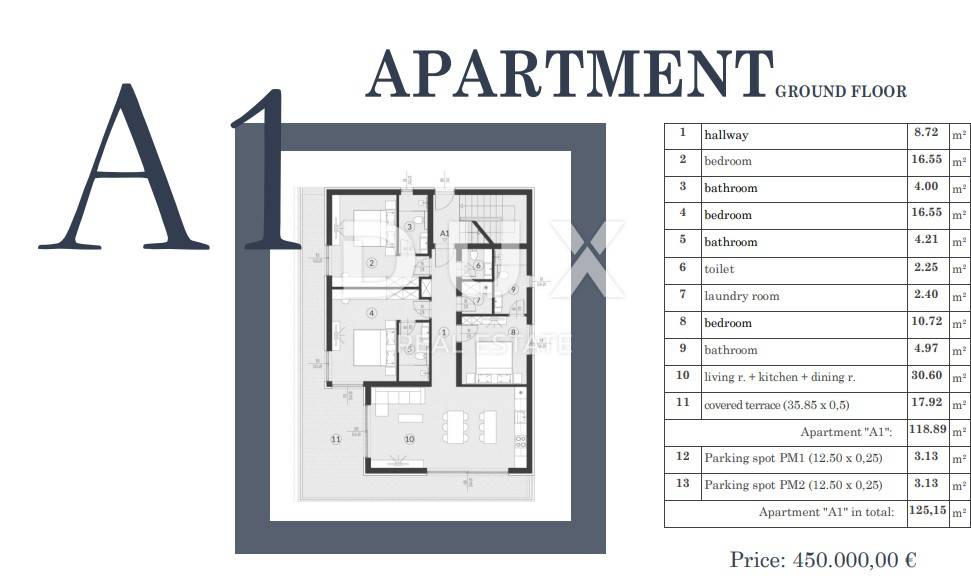 A rarity on the market! We offer an interesting project of new luxury apartments. The project consists of two residential buildings, each of which contains 3 residential units, and each residential unit will be located on its own floor of the building. That is, the buildings are of one volume, raised ground floor + 2 floors and one basement floor for storage and garage spaces. Both buildings in the project contain their own outdoor heated swimming pool, which will be covered with high-quality mosaic, and the garden landscaped with greenery and lighting. Pictures of the building, the possible decoration of the apartment and the floor plan are visible on the ad. INFORMATION ABOUT THE APARTMENT: Apartment A1, located on the ground floor of building "A", has a total living area of 125.15 m2; Within the mentioned square footage, the apartment consists of an entrance hall that separates the private space of the apartment from the space for everyday life. Thus, there are 3 spacious bedrooms in the private space, each of which has its own bathroom. Then there was an additional guest toilet and a laundry room. At the end of the corridor there is a spacious and sunny "open space" area with a comfortable spacious living room, kitchen and dining room. From the living room there is access to the outdoor covered terrace. The apartment has one outdoor parking space and one parking space in the garage. METHOD OF PAYMENT: Reservation of the apartment, i.e. 10% deposit, the rest of the purchase price can be paid upon handover by credit or payment ADDITIONAL INFORMATION ABOUT THE APARTMENT; * All apartments will be equipped with top-quality equipment from renowned domestic and foreign manufacturers, and first-class three-layer oak parquet will be installed, as well as high-quality Italian ceramic tiles of larger dimensions. * Underfloor heating is included in the price and will be installed in all rooms of the apartment. * Included in the price is the installed heat pump for hot water regulation. * Each bedroom and living room will be air-conditioned with high-quality inverter air conditioners. In the current phase of construction, the customer has the right to choose ceramic floors and influence certain design elements. The investor also offers buyers the option of decorating and furnishing the apartments as shown in the pictures, with a pre-agreed surcharge. LOCATION: The location where the buildings are located is ideal for peaceful and safe family coexistence. Only a few short minutes away are shops and larger retail chains, a school, a kindergarten, as well as the famous Medulin waterfront, numerous beaches and a marina. In addition to being ideal for families, the location is also ideal for all those looking for their own corner of peace during or out of season, as well as for all those looking for an opportunity to develop a luxury tourist offer. VAT is included in the visible price on the advertisement, and the buyer has no obligation to pay real estate sales tax! For more information or to organize an appointment to view the property, feel free to contact us!