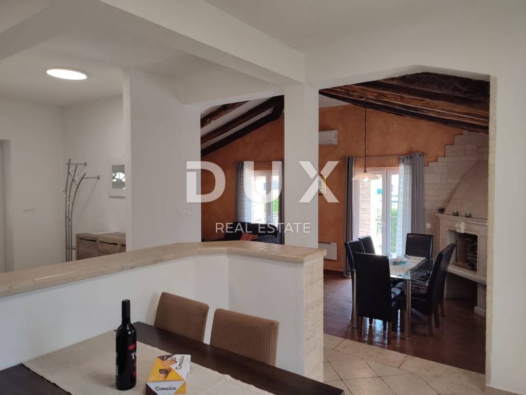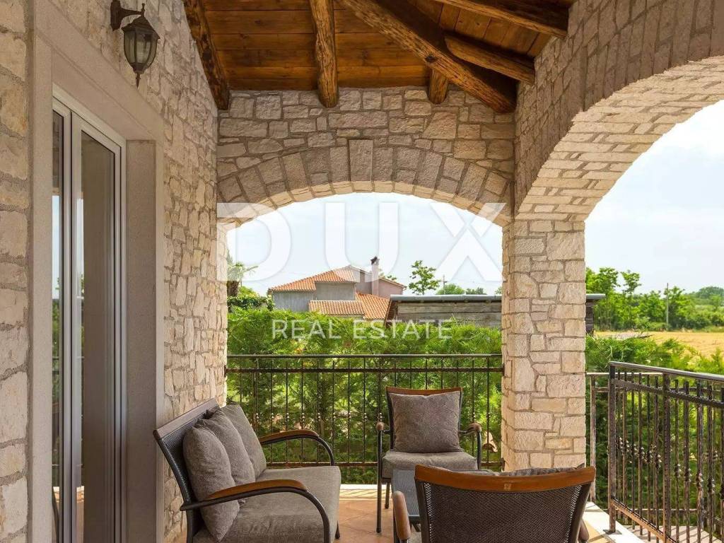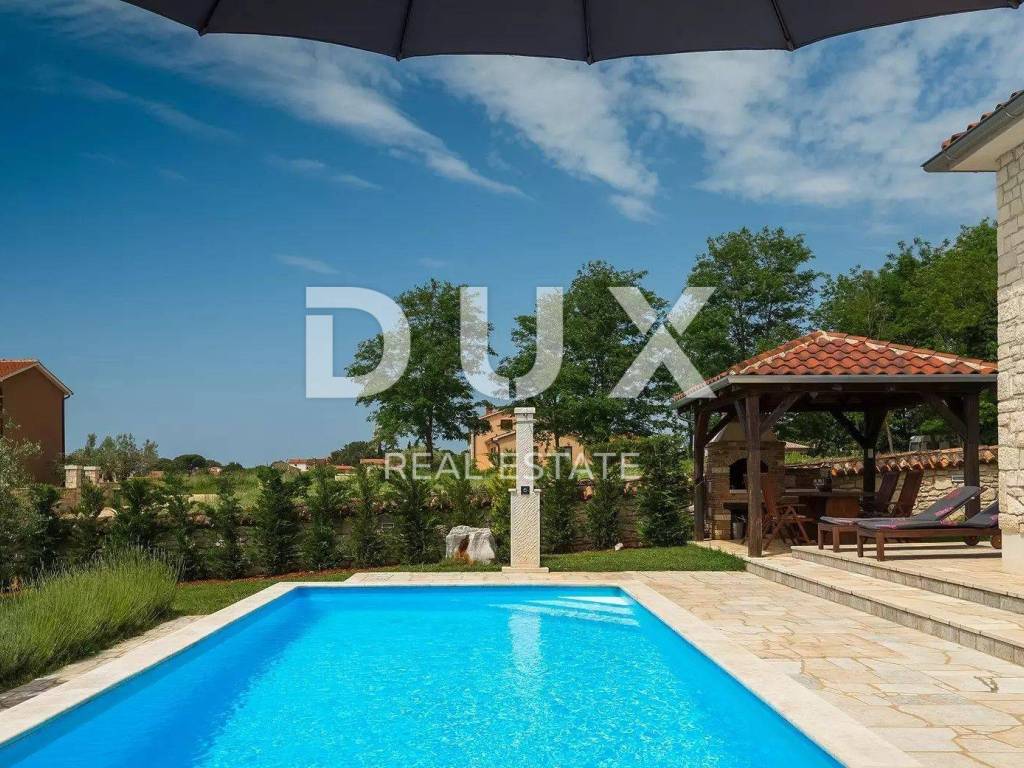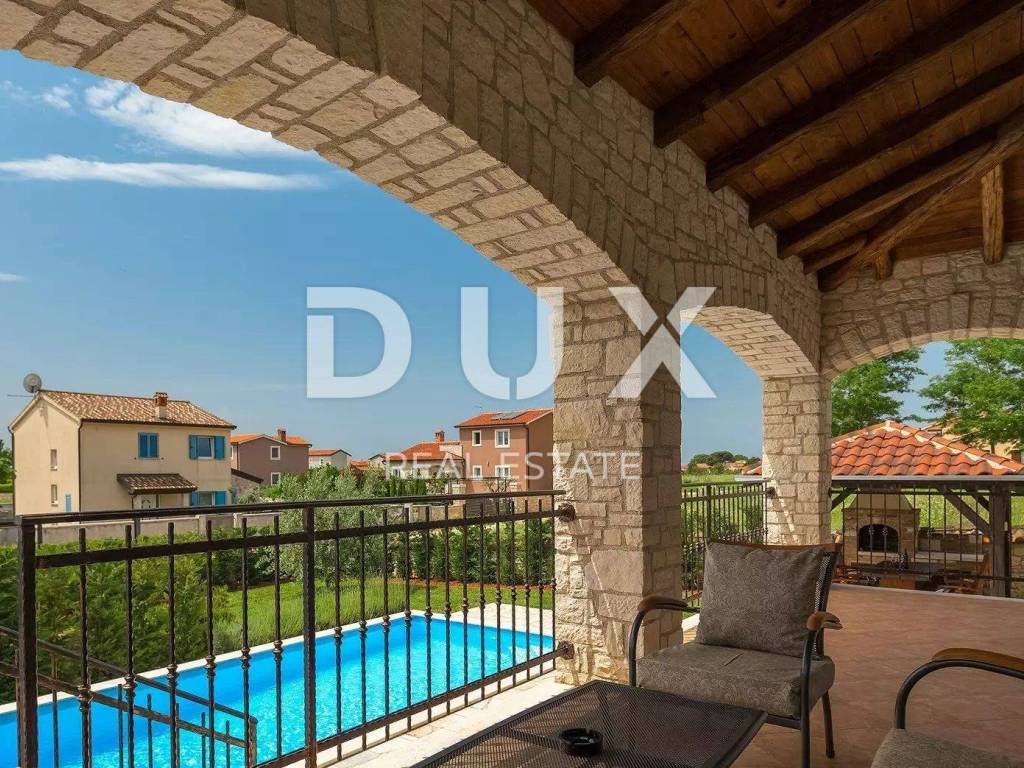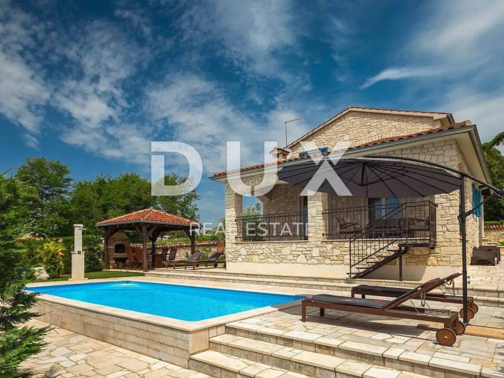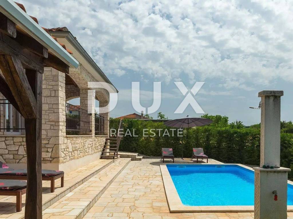 A charming stone villa built in the traditional Istrian style with distinctive blue shutters, located in the suburbs of Poreč. The traditional Istrian style is combined with a beautifully decorated interior, which contains all the necessary modern conveniences in a homely atmosphere. The house has a total area of 145 m2 and extends over two floors. On the ground floor there is a spacious living room and dining room with a kitchen that has a separate exit to the yard, one bedroom, a bathroom and a storage room. From the dining room and living room there is access to a covered terrace with a beautiful view of the pool and yard. A stone staircase leads to the first floor, where there are two more spacious bedrooms, one with its own bathroom and another separate bathroom. Cooling is through air conditioning, and heating is possible through wall-mounted electric regulators. On the 770m2 plot there is a 33m2 swimming pool and a covered summer kitchen and dining room, where you can enjoy family meals prepared on the grill and a view of the beautiful green garden. The house also has a covered parking space for three cars. It is located very close to the highway exit. Restaurants, wineries, school, kindergarten, post office, shop, nature park are nearby. The distance from Poreč and the beach is only 12 km.