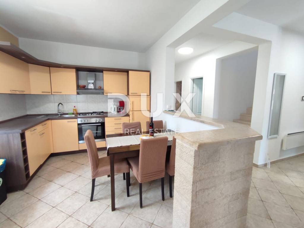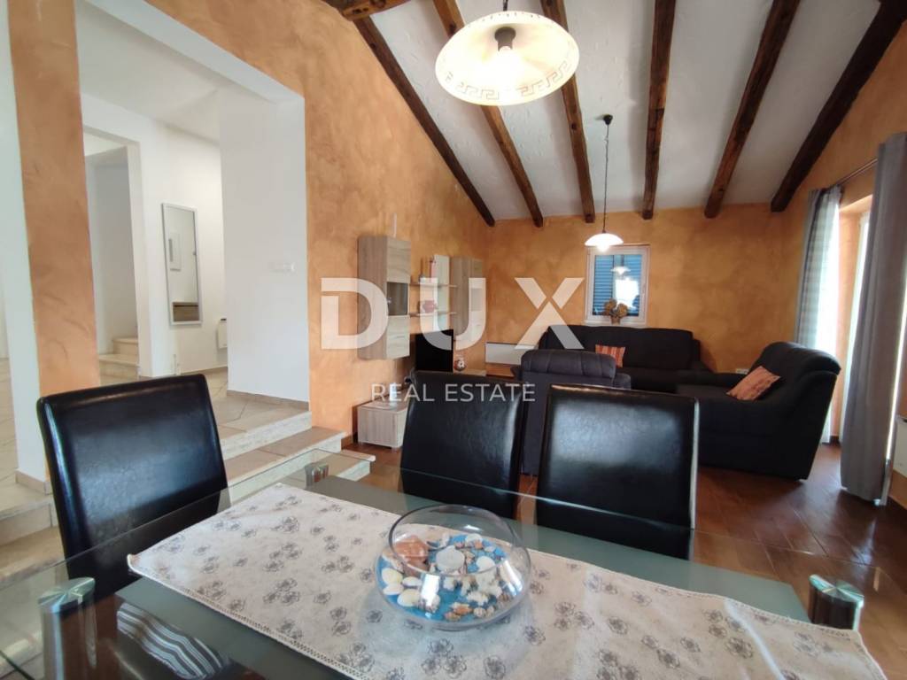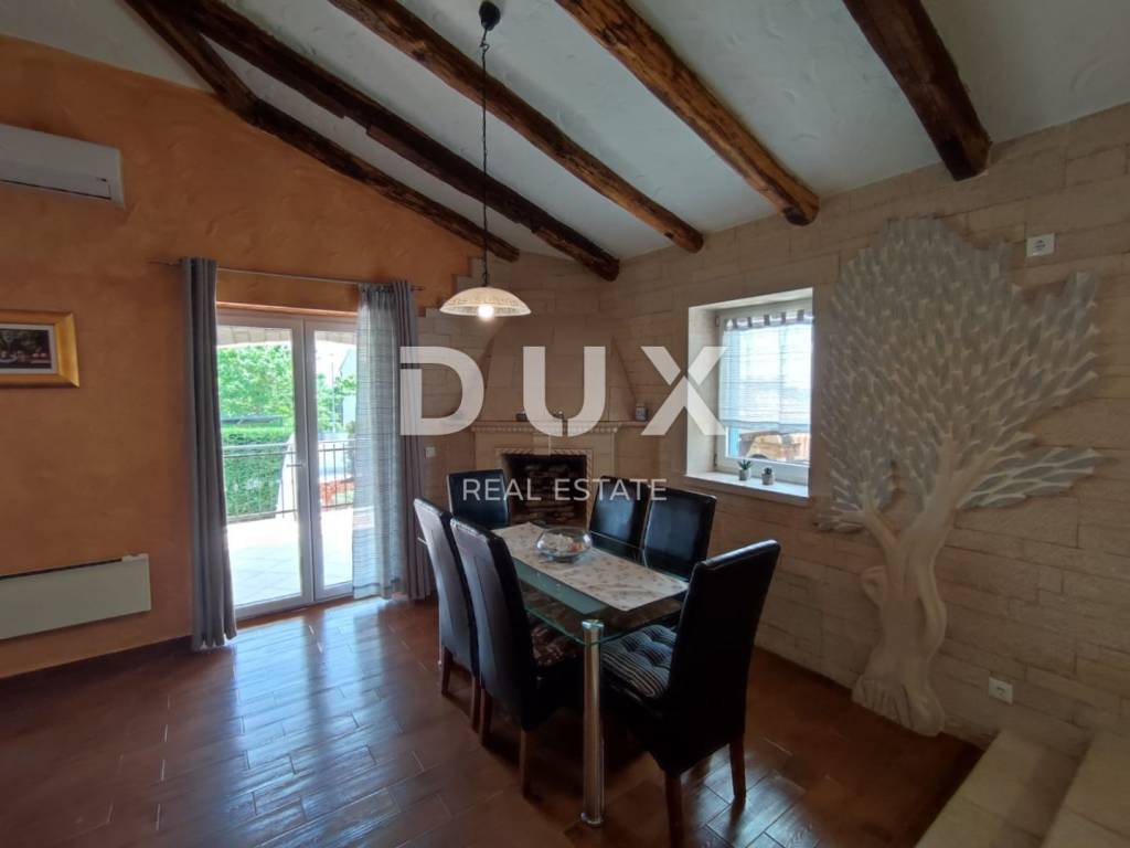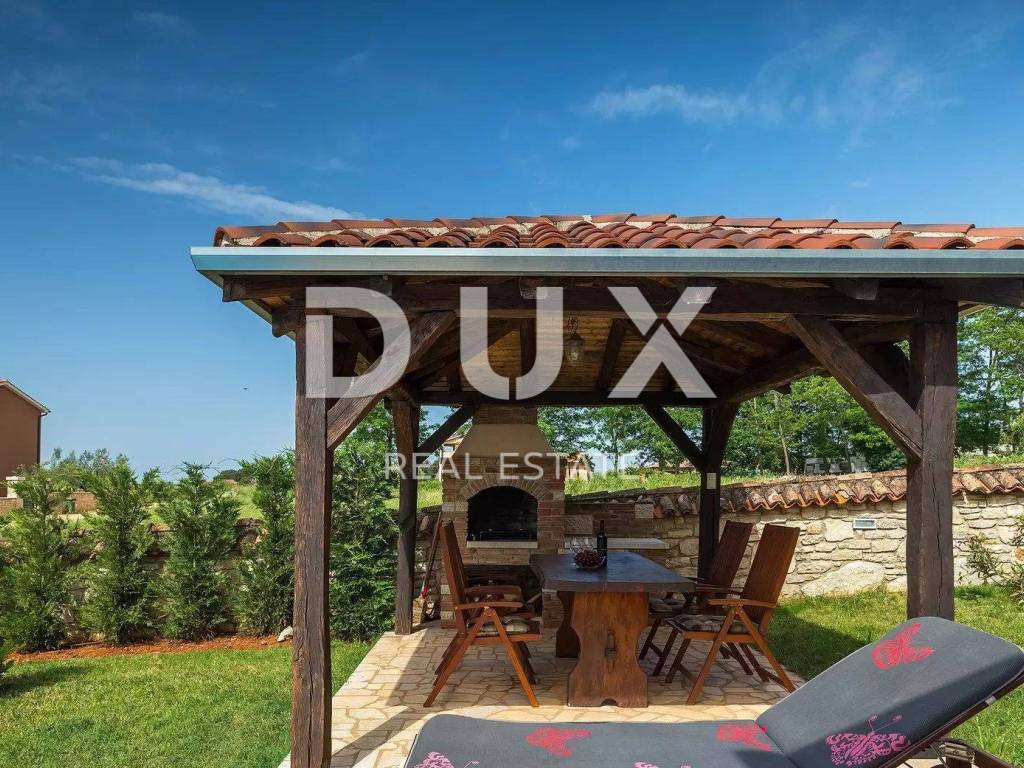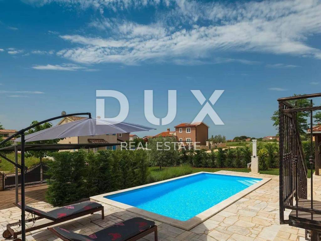 A charming stone villa built in the traditional Istrian style with distinctive blue shutters, located in the suburbs of Poreč. The traditional Istrian style is combined with a beautifully decorated interior, which contains all the necessary modern conveniences in a homely atmosphere. The house has a total area of 145 m2 and extends over two floors. On the ground floor there is a spacious living room and dining room with a kitchen that has a separate exit to the yard, one bedroom, a bathroom and a storage room. From the dining room and living room there is access to a covered terrace with a beautiful view of the pool and yard. A stone staircase leads to the first floor, where there are two more spacious bedrooms, one with its own bathroom and another separate bathroom. Cooling is through air conditioning, and heating is possible through wall-mounted electric regulators. On the 770m2 plot there is a 33m2 swimming pool and a covered summer kitchen and dining room, where you can enjoy family meals prepared on the grill and a view of the beautiful green garden. The house also has a covered parking space for three cars. It is located very close to the highway exit. Restaurants, wineries, school, kindergarten, post office, shop, nature park are nearby. The distance from Poreč and the beach is only 12 km.