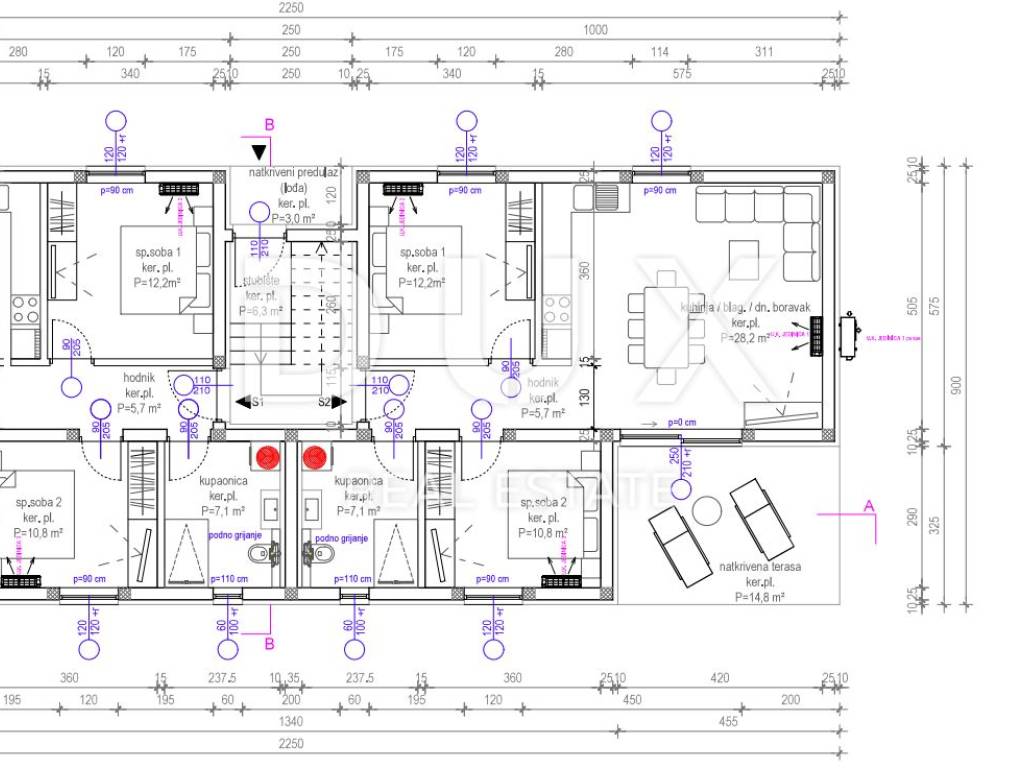 Apartment for sale on the ground floor of a new building in Privlaka, only 140 meters from the beach. This apartment offers peace, quiet and privacy, perfect for relaxation and enjoyment. The living area is 71.4 m2, while the yard occupies 56.25 m2. The apartment has a covered terrace, two bedrooms, a spacious living room and a modern bathroom. One parking space is included in the price. The building was built with high insulation standards, with 10 cm Styrofoam. The entrance door of the building is aluminum, anthracite color, with an electric lock and a video intercom. The entrance and staircase are paved with first-class ceramic tiles, along with an INOX fence. Corridors and staircases are equipped with fire-fighting equipment for the safety of tenants. The entrance doors to the apartments are anti-burglary and fireproof. The apartment is equipped with modern technologies with internet and satellite connections in the living room and bedrooms. The floors in the kitchen, living room and terrace are covered with first-class ceramic tiles, while the bedrooms have SPC floor coverings. The PVC carpentry is anthracite on the outside and white on the inside, with three-chamber glass and electric blinds on all windows and sliding walls, with built-in mosquito nets. The rooms are heated and cooled by a Vaillant air conditioner, while the bathrooms are equipped with electric underfloor heating. Bathrooms are equipped with modern furniture, double sinks, hanging toilet bowls, built-in cistern and walk-in glass wall. LED lighting has been installed in all rooms, and the balconies have combined brick and glass railings. Apartments are sold unfurnished, with fully equipped bathrooms. Completion of construction works is scheduled for June 1, 2024, followed by a technical inspection and floor plan of the building. This property represents an ideal opportunity for anyone looking for a modern and quality home near the sea. For more information and to arrange a viewing, feel free to contact us.