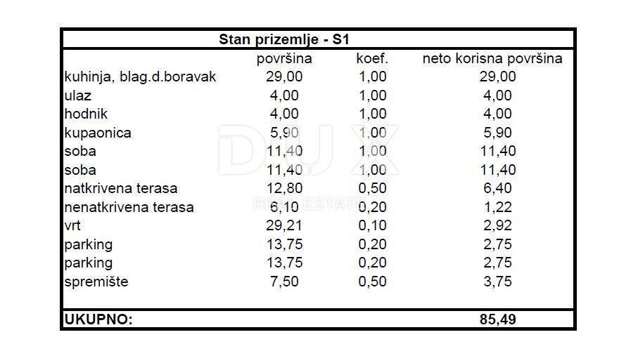 A modern apartment with a garden under construction in the Skročini area of Zadar is for sale. The apartment with a living area of 75.70 m2 is located on the ground floor of a smaller residential building with eight units. It consists of two bedrooms, living room, kitchen and dining room, hallway and bathroom. The apartment has one covered and one uncovered terrace, a garden of 29.21 m2, a storage room in the basement, and two outdoor parking spaces. The total useful value of the area of the apartment together with all accessories is 85.49 m2. The apartment is air-conditioned, and high-quality materials were used in the construction, such as thermal insulation on the facade, 10 cm styrofoam. Parquet and ceramic tiles were used for the floor coverings, and the joinery is PVC. The planned construction completion date is 2025. Nearby there are all the necessary facilities for everyday life, such as shops, schools, kindergartens or shopping centers. The city center is a 30-minute walk away, and the nearest and oldest city beach, Marex, is a 20-minute walk away. Zadar is the urban center of Northern Dalmatia, which, due to its favorable position in the central part of the Adriatic coast, is becoming the most visited tourist destination in Dalmatia. In addition to numerous attractions and rich content, Zadar is located near various National Parks such as Kornati and picturesque towns on the Adriatic coast such as Nin, Biograd na Moru and others.