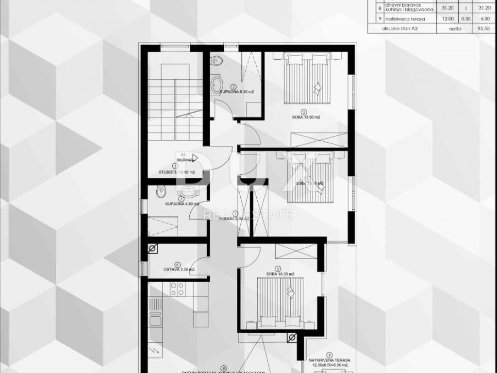 We proudly present the project of an exclusive modern building located in one of the most sought-after locations on this part of the coast of the Istrian peninsula, the unmissable Pješčana Uvala. Only 300m from the apartment there is a beautiful beach, as well as numerous other amenities needed for a safe and peaceful everyday stay. It is a modern building consisting of a total of three floors and three residential units, each of which is on its own floor. It is a new building of top quality worthy of your attention. The location where the building is located provides its future owners with a unique stay, as well as representing a safe investment with an almost guaranteed return on investment. Head with us towards this opportunity, and maybe right here, the search for your dream property will find a happy ending. DESCRIPTION OF THE APARTMENT: We present an apartment located on the 1st floor of a new building, which consists of a total of 101.90m2 of space, of which 95.50m2 belongs to the apartment, while the rest of the square footage refers to 2 private parking spaces and a storage room on the ground floor of the building. Within its 95.50 m2 of living space, this apartment consists of an entrance hall with a space for a wardrobe, which also divides the apartment into a part intended for daily life and a sleeping part of the apartment. The living area of the apartment is designed according to the "open space" system of space without partition walls, in which there is a spacious kitchen with enough space for a kitchen island, a spacious dining room for the whole family, and a larger living room that is ideal for socializing and relaxing after an active day. Access to the covered terrace of 12m2 (reduced area 6m2) extends from the living room. The apartment additionally consists of a storage room at the back of the kitchen, then a guest bathroom, and 3 comfortable bedrooms, one of which is the master bedroom with its own bathroom, while the other two bedrooms have access to the same terrace as the living room. ADDITIONAL INFORMATION: * The planned deadline for the completion of all works and the possibility of moving in is before the summer season of 2025. * Each apartment will be equipped with air conditioning and underfloor heating. * High-quality Styrodur insulation of 10 cm is placed on the facade of the building. * High-quality two-layer aluminum joinery is being installed. * The apartment's bathroom will be fully furnished. * Buyers currently have the opportunity to influence the final stage of decorating the apartment, such as choosing the type of floor coverings, colors and the like. * Apartments are sold turnkey, without furniture. * The purchase of an apartment is carried out in percentage stages. DESCRIPTION OF THE LOCATION: This is a highly valuable location, which provides its visitors with a unique stay. Pješčana Uvala contains everything you need for a safe and peaceful life, so just a 1-minute walk from the apartment, there is the first store, numerous restaurants, cafes and the like. The aforementioned well-maintained beach and promenades are only a 3-minute walk from the apartment, and in addition to the crystal clear sea, they offer their visitors numerous other facilities, such as beach bars, restaurants by the sea, beach volleyball courts, soccer fields, basketball courts, and the like. In addition to all the above, Pješčana Uvala is also known for being located next to one of the most respected marinas on the Istrian peninsula, which offers sea and boat lovers a professional boat care service, as well as an annual mooring. Next to the sandy cove is the Soline Forest Park, which is an ideal destination for a getaway to nature with the family, as well as a location for a perfect walk in the fresh air. In short, it is a location that is ideal for all those who are looking for a family property that will provide them with a peaceful stay, without large crowds and noise, while still being within reach of their necessary amenities. As well as representing an ideal location for all those who are looking for rare and valuable real estate, which almost ensures a return on investment in the form of tourism. For any additional questions, necessary information, as well as a tour of the location and an overview of the project documentation, feel free to contact us at any time! Dear clients, the agency commission is charged in accordance with the General Business Conditions www.dux-nekretnine.hr/opci-uvjeti-poslovanja
