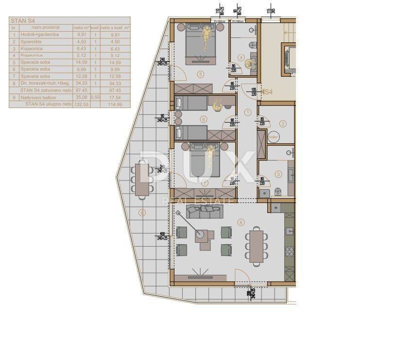 A luxury apartment in a new project is for sale in one of the most attractive locations. It is an apartment that offers 119.12 m2 of living space and is located on the first floor. It consists of a hallway with a wardrobe, a large living room with a kitchen and a dining room with access to a covered terrace, 3 bedrooms and two bathrooms. LOCATION: - the project is located 400 meters as the crow flies from the first beach - quiet environment with attractive family houses - walking distance from shops, beach bars, restaurants APARTMENT EQUIPMENT (BUILDING) - within the building there are parking garage spaces and outdoor parking lots that they buy with an additional charge at the displayed price - the building also offers an elevator, which makes this project even more attractive - underfloor heating - air conditioning - parquet in the rooms - electric shutters with mosquito nets Start of work 10/24, expected end of work 12/25. The seller is a legal entity. We are available for all other questions.