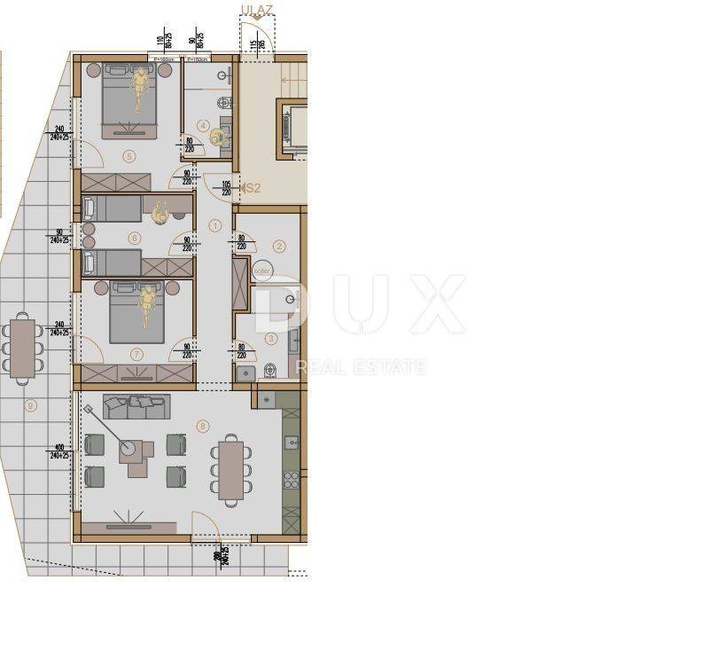 A luxury apartment in a new project is for sale in one of the most attractive locations. It is an apartment that offers 119.12 m2 of living space and is located on the first floor. It consists of a hallway with a wardrobe, a large living room with a kitchen and a dining room with access to a covered terrace, 3 bedrooms and two bathrooms. LOCATION: - the project is located 400 meters as the crow flies from the first beach - quiet environment with attractive family houses - walking distance from shops, beach bars, restaurants APARTMENT EQUIPMENT (BUILDING) - within the building there are parking garage spaces and outdoor parking lots that they buy with an additional charge at the displayed price - the building also offers an elevator, which makes this project even more attractive - underfloor heating - air conditioning - parquet in the rooms - electric shutters with mosquito nets Start of work 10/24, expected end of work 12/25. The seller is a legal entity. We are available for all other questions.
